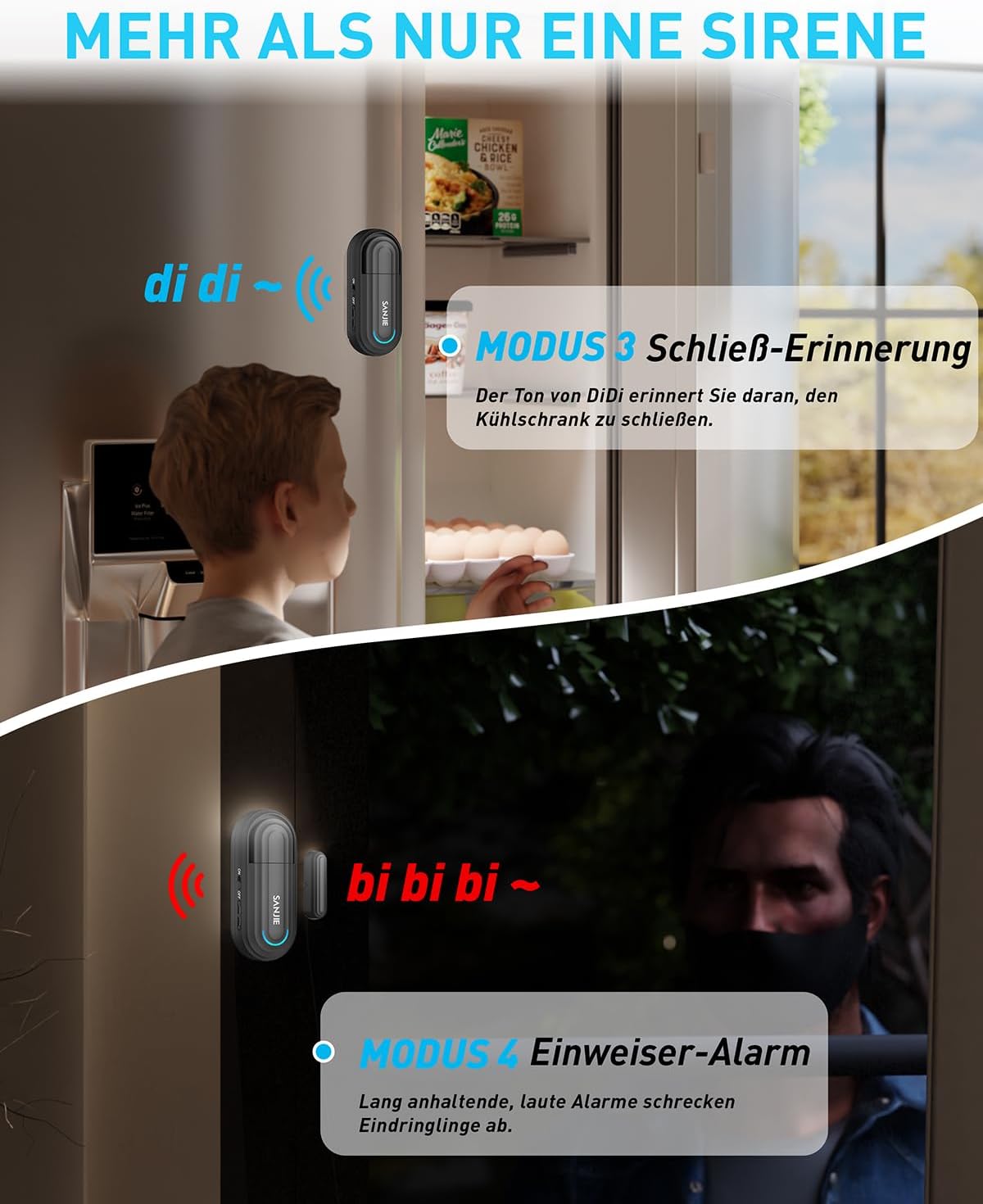 MODOS MULTIFUNCION: 1. MODO DE ALARMA NORMAL: la alarma dura un minuto cuando se abre la puerta o la ventana (Puedes cerrar laarna con el mando a distancia); 2. MODO DE ALARMA Y Parada: SE Alarlará Cuando la Puerta o La Ventana SE Abra y Detendrá La Alarma Tan Pronto Como Cierre la Puerta o La Ventana; 3. MODO DE TIMBRE — Sonido «Ding Dong» para Recordarle Cuando Alguien Presiona La Puerta para Entrar