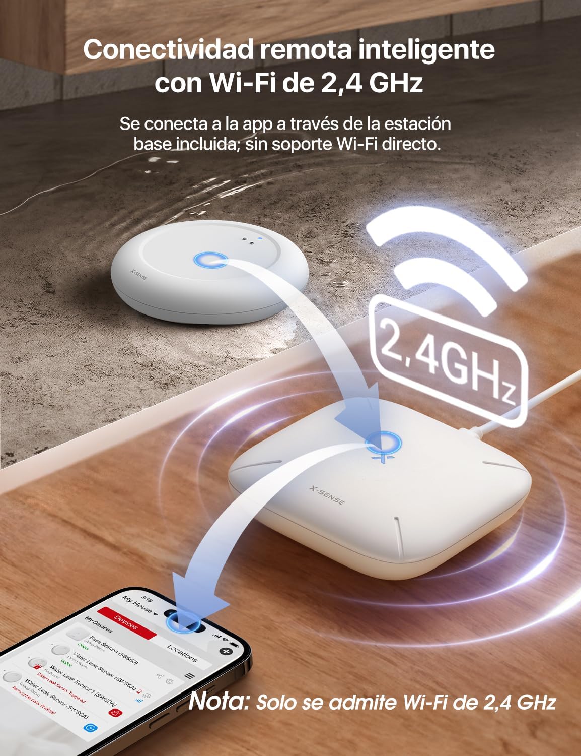 Alarma de estación base: cuando se detecta agua, el LED de este detector de fugas de agua parpadea en rojo, pero solo la estación base emite una alarma; Si quieres un modelo en el que suenen tanto el dispositivo como la estación base, considera el X-Sense SWS54 Package con detector de fugas de agua Wi-Fi.