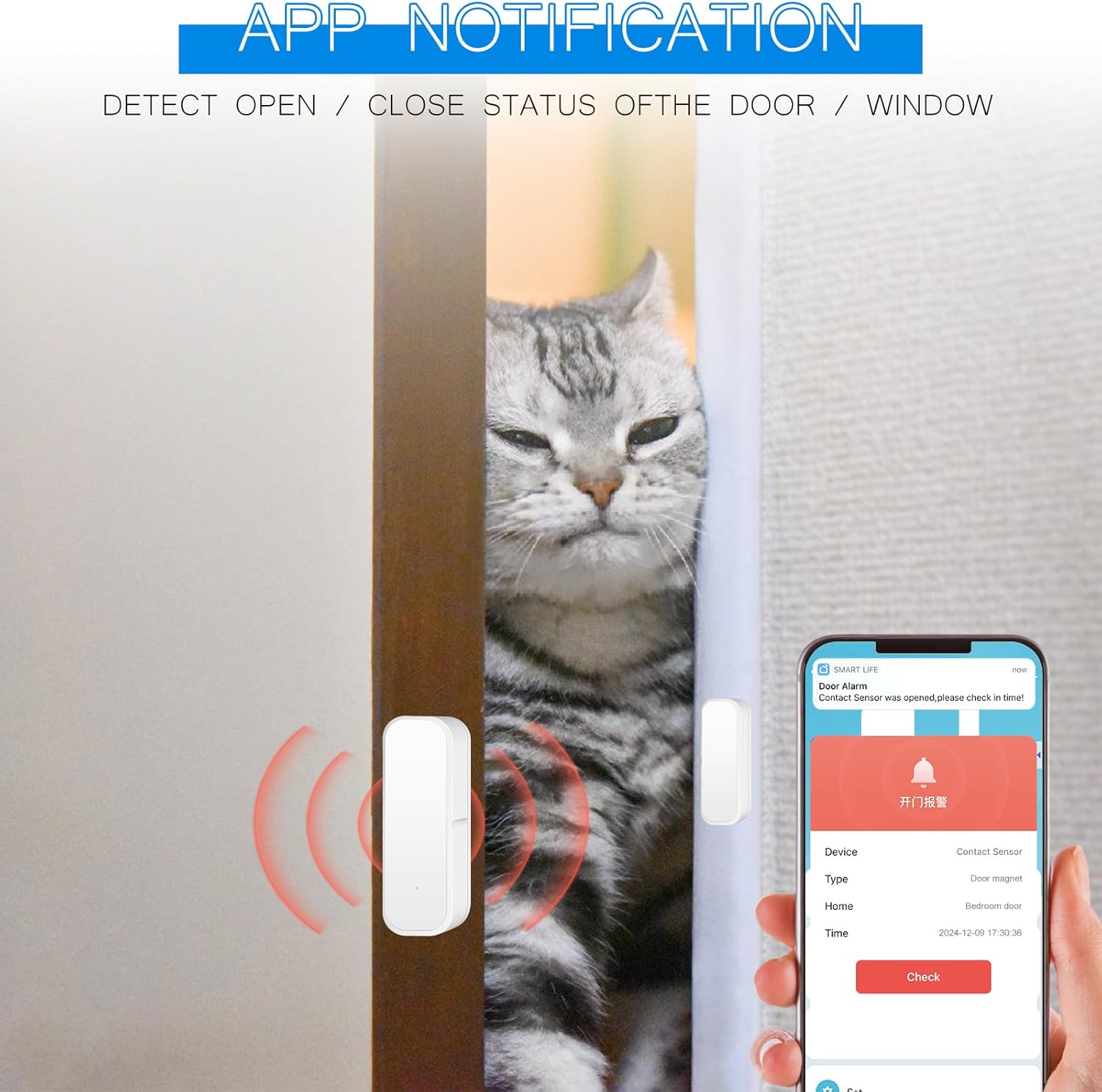 KIT DE SENSOR DE PUERTA WIFI: amplíe la automatización de su hogar inteligente con el sensor de puerta WiFi; Al combinar WiFi y conexión de teléfono móvil, ya sea en casa o de viaje, el sensor de contacto WiFi inteligente envía una notificación para informarle cuando la puerta/ventana está abierta o cerrada.