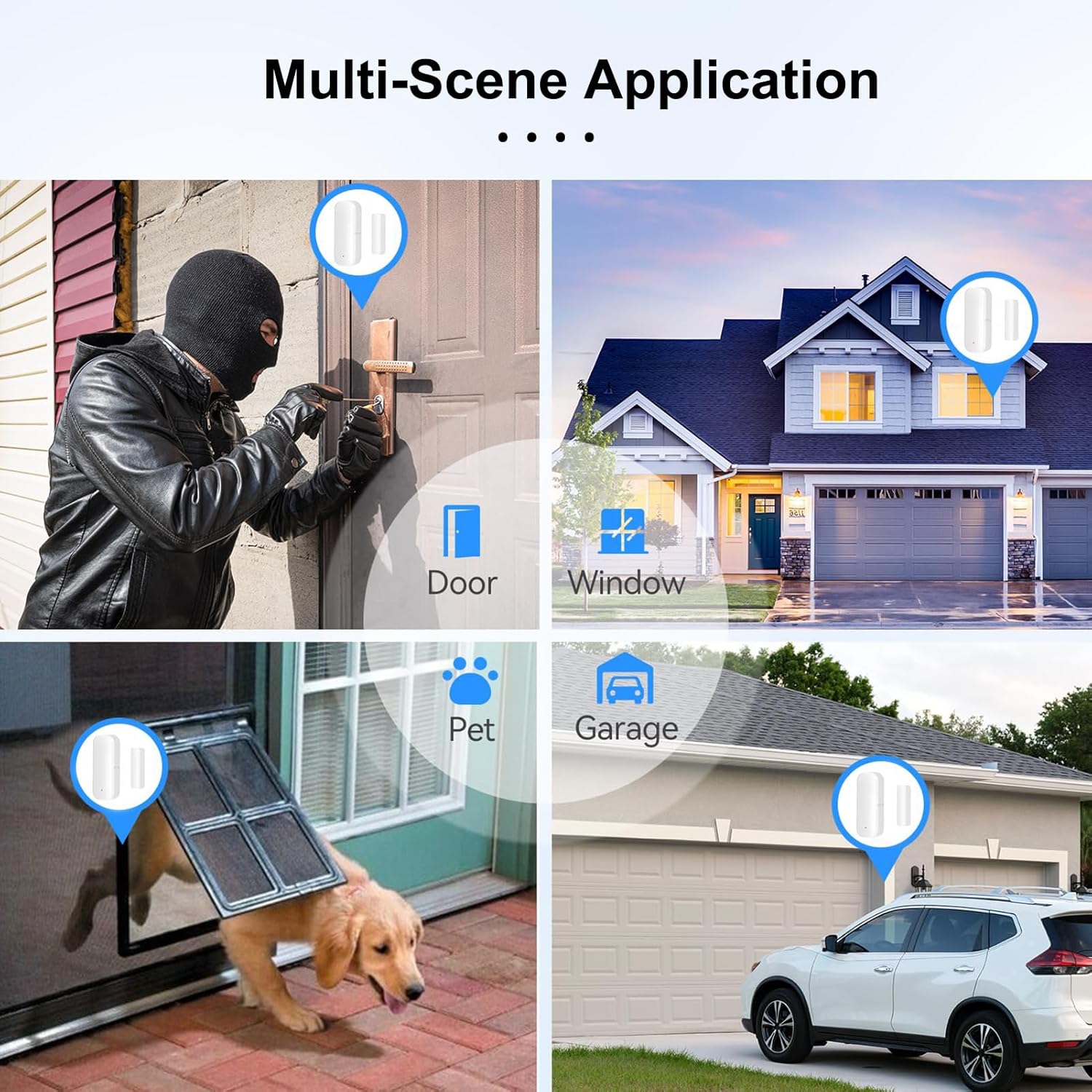 【Sensor de puerta y ventana inteligente WiFi】 El sensor de alarma de puerta y ventana está diseñado para monitorear el estado abierto o cerrado de cualquier entrada; Una notificación de alerta se envía automáticamente en 10 segundos una vez que se activa el sensor; Perfect para puertas frontales, ventanas, habitaciones de bebés, garajes y más; El estado de la puerta y la energía de la batería se pueden verificar en la aplicación; Un accesorio imprescindible para el sistema de seguridad.