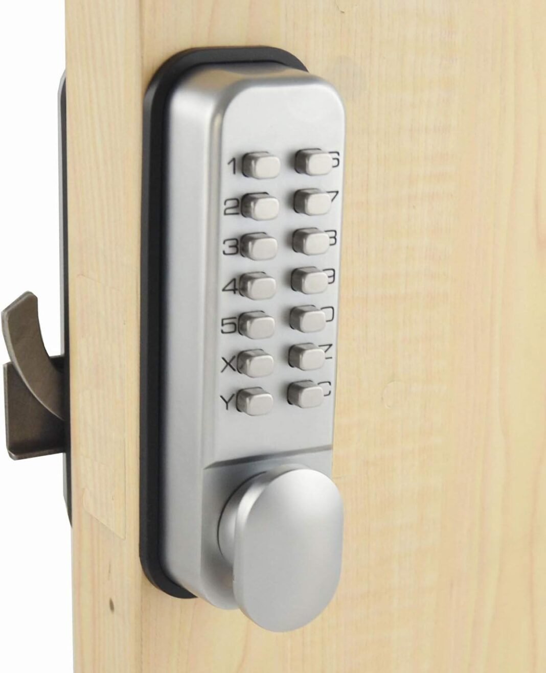 – Fácil de instalar, no es necesario hacer un orificio para el pestillo, se proporciona una plantilla de instalación.NOTA:Asegúrese de que todas las piezas funcionen correctamente antes de la instalación.No apriete demasiado los pernos de fijación, ya que puede causar distorsión y carga a un funcionamiento deficiente.No cierre la puerta antes de que el código y el trabajo de bloqueo confirmen correctamente.