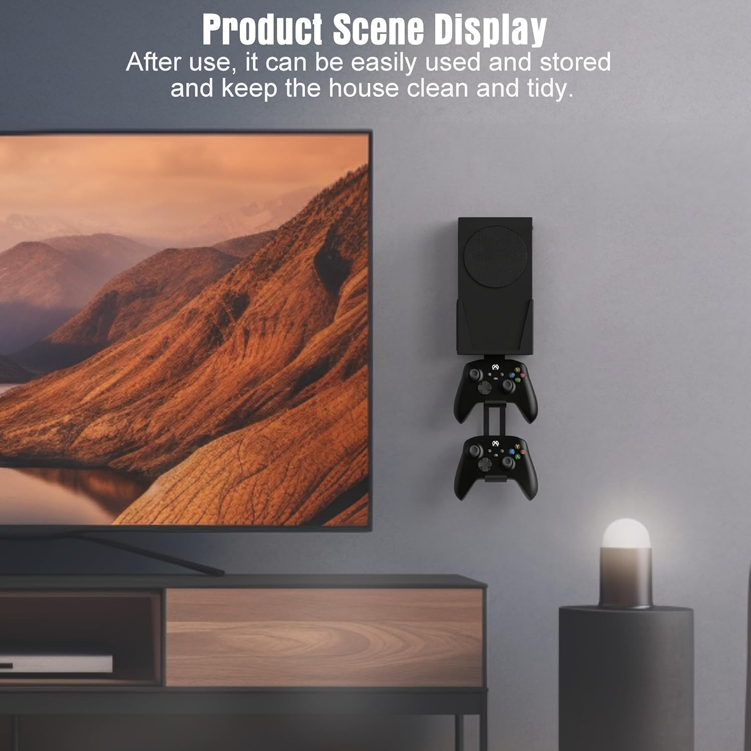 Diseño personalizado El equipment de montaje en pared está especialmente diseñado para la consola Xbox Sequence S, con soportes para controlador twin desmontables y un colgador para auriculares, que se puede montar o desmontar libremente según sus necesidades. (Este soporte de pared no es suitable con Xbox One S, Xbox 360s, Xbox One, Xbox Sequence X o Xbox One X)