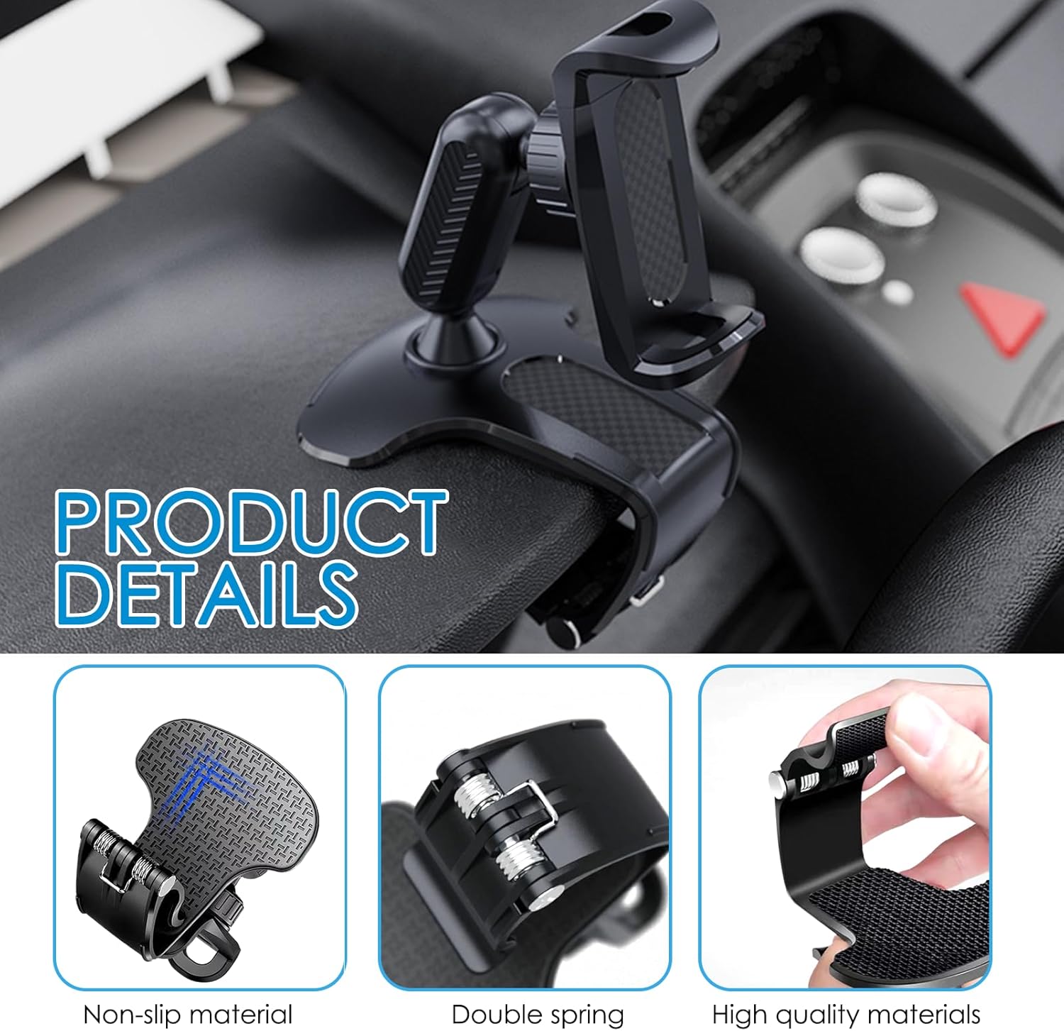Estructura robusta y estable: fabricado con materiales duraderos como plástico ABS y acero inoxidable, este soporte para teléfono para automóvil garantiza una sujeción segura en el automóvil. Su robusto mecanismo de abrazadera mantiene el teléfono en su lugar, incluso en caminos irregulares, asegurando estabilidad y confiabilidad.