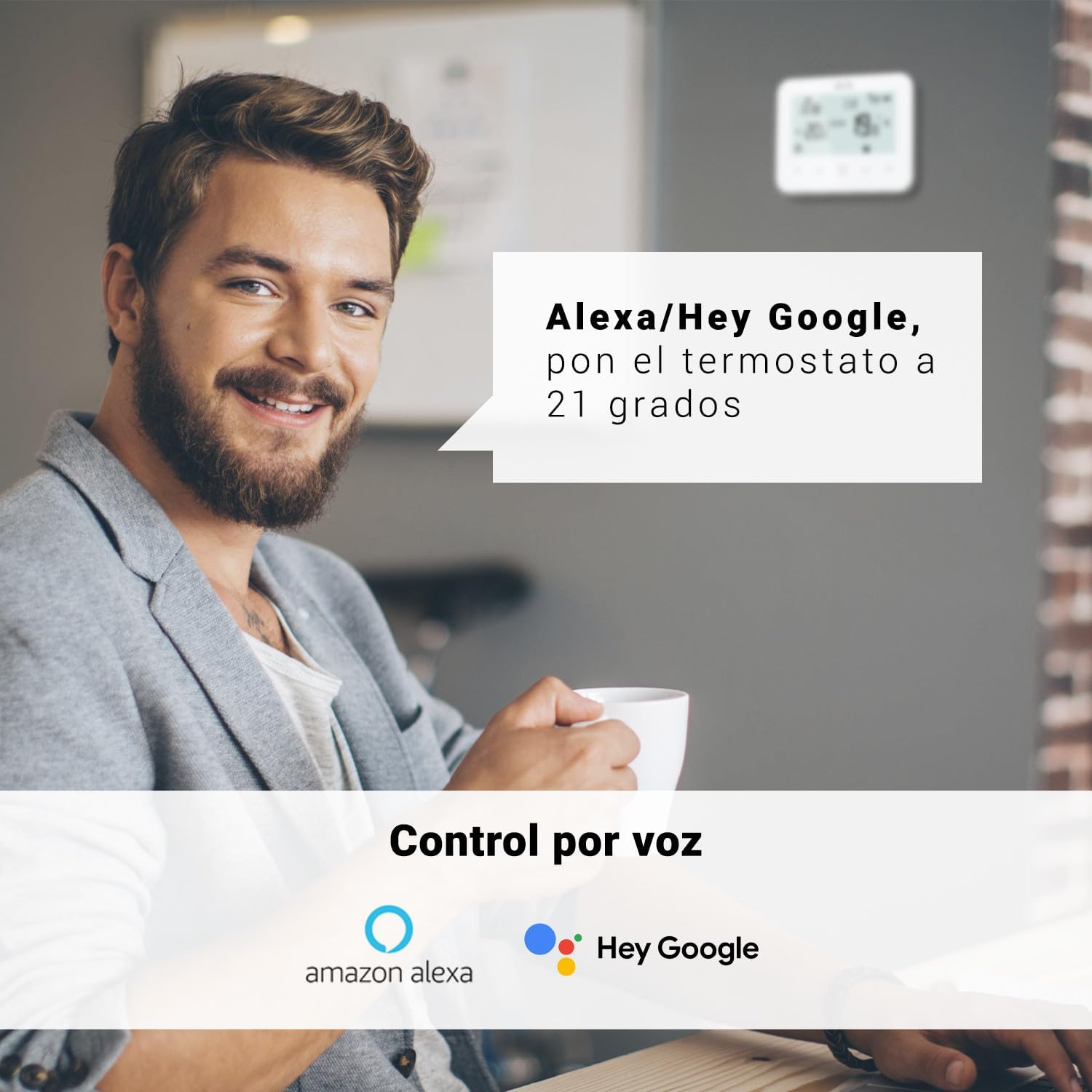 ES Suitable Con Amazon Alexa y Google Asistente – El Termostato Inteligente Puede Manejarse A Través de la Pantalla Tálil Retroiluminada en shade Azul, un Través de la Aplicacia Spc Iot y Con Comandos de Voz Configurado en Alexa O Google Assistant. Basta Con Configuuro un comando como «Alexa/Hey Google, Pon El Termostato A 21 Grados» Para que la Caldera Empiece A Trabajar.
