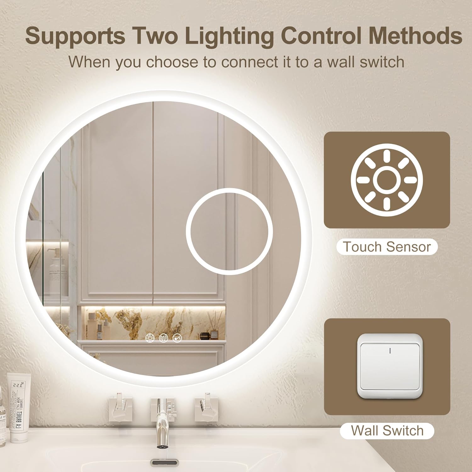 Espejo de Atenuació Enteligente: El Espejo de Baño Redondo Starlead de 80 cm Con iluminaciós es regulable. Puede Ajustar El Brillo del 10% Al 100% Tocando El Botón de Encendido/Apagado en El Lado Izquierdo Durante 2-3 SEgundos y Toque El Botón Dos Veces para Cambiar la Temperatura de coloration (3000 K/4500K/6500K). Gracias a la Función de Memoria, no es necesario Volver a Ajustar la temperatura Cada Vez.