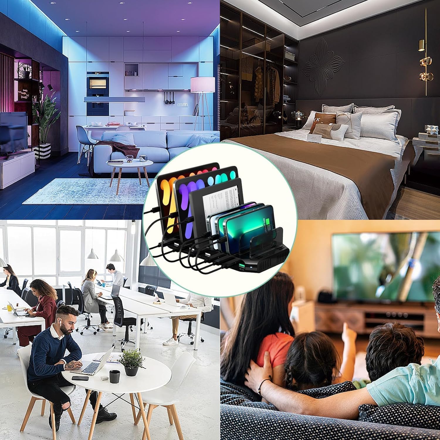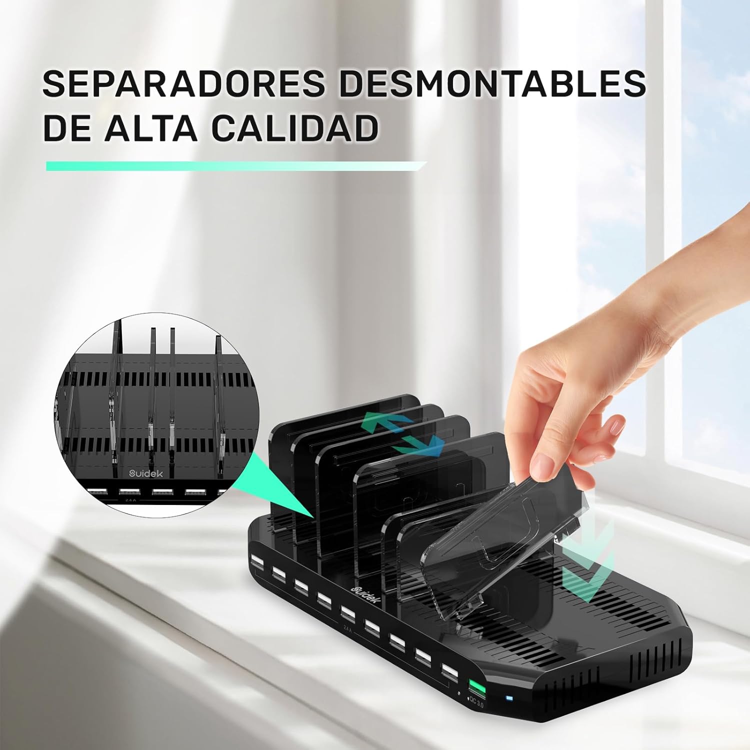 Estación de carga de dispositivos: carga hasta 10 dispositivos a la vez y proporciona hasta 5 V/1.5 A por puerto. Con tecnología BC1.2, proporciona hasta 5 V/2.4 A para una carga rápida. Mantén tu smartphone, tableta y otros dispositivos organizados en un solo cargador.