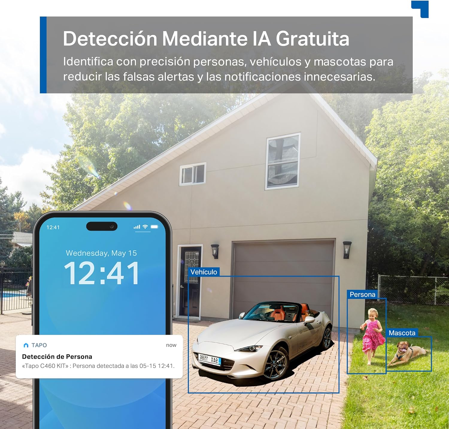 Detección de IA gratuita La cámara utiliza inteligencia synthetic para identificar con precisión personas, mascotas y vehículos, minimizando falsas alarmas y reduciendo notificaciones innecesarias.
