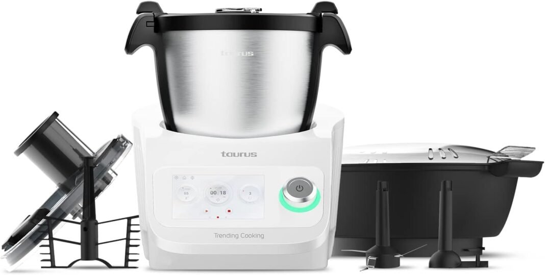 Trending Cooking es el robotic de cocina multifunción con Wi-Fi que marca tendencia. Dispone de pantalla táctil de 5″ y conexión Wi-Fi que te permitirá actualizar su recetario periódicamente, con jarra en acero inoxidable de gran capacidad de 3.5L, báscula incorporada y con múltiples accesorios libre de BPA, para realizar 28 funciones culinarias y elaborar todo tipo de platos Todo, en un diseño compacto y de tendencia. Tu mejor aliado en la cocina ha llegado. Crea infinidad de recetas gracias a su modo handbook, o bien, si prefieres un proceso de cocinado más cómodo, elige el modo recetas guiadas. robotic de cocina se encargará de guiarte paso a paso para elaborar sus 150 recetas ya integradas, gracias a la conexión Wi-Fi el recetario se irá actualizando mensualmente con 15 nuevos platos y experiencias de sabores entrantes, carnes, pescados, postres y recetas deliciosas. te sorprenderán El robotic de cocina Trending Cooking dispone de unas prestaciones de velocidad, tiempo y temperatura que te permitirán realizar 28 funciones culinarias: procesa, rebana, corta, pulveriza, tritura, pica,. emulsiona, ralla, trocea, muele, monta, amasa, mezcla, remueve, bate, confita, cocina con precisión grado a grado, al baño maría, con fuego lento, al vapor, hierve, sofríe, licua, fermenta, turbo, calienta, mantén caliente y pesa. Todo, en un solo robotic. Y para una mayor comodidad, podrás acceder a 8 funciones preestablecidas con solo pulsar un botón: amasar, cocinar al vapor, hervir, procesar, picar, cocinar lentamente, triturar con turbo y pesar. Cocina tus recetas favoritas de la forma más fácil y rápida con el robotic de cocina Trending Cooking. Cuenta con 12 velocidades, temperatura regulable de 37º a 120ºC, tiempo de cocción hasta 90 minutos y báscula integrada para una mayor comodidad con 5g de precisión. Elabora un sin fin de recetas gracias a los accesorios que lleva incorporados: cuchilla, batidor, espátula, cesta de vapor, vaso medidor, paleta removedora, procesador de alimentos y vaporera de 2 niveles. Todos los accesorios son libres de BPA y aptos para el lavavajillas.