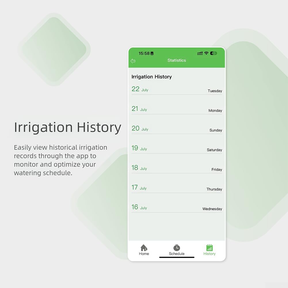 *Eficiencia de riego programada: establezca múltiples horarios de riego para automatizar el proceso, conservando el agua y optimizando la salud de sus plantas entregando la cantidad justa en el momento adecuado.