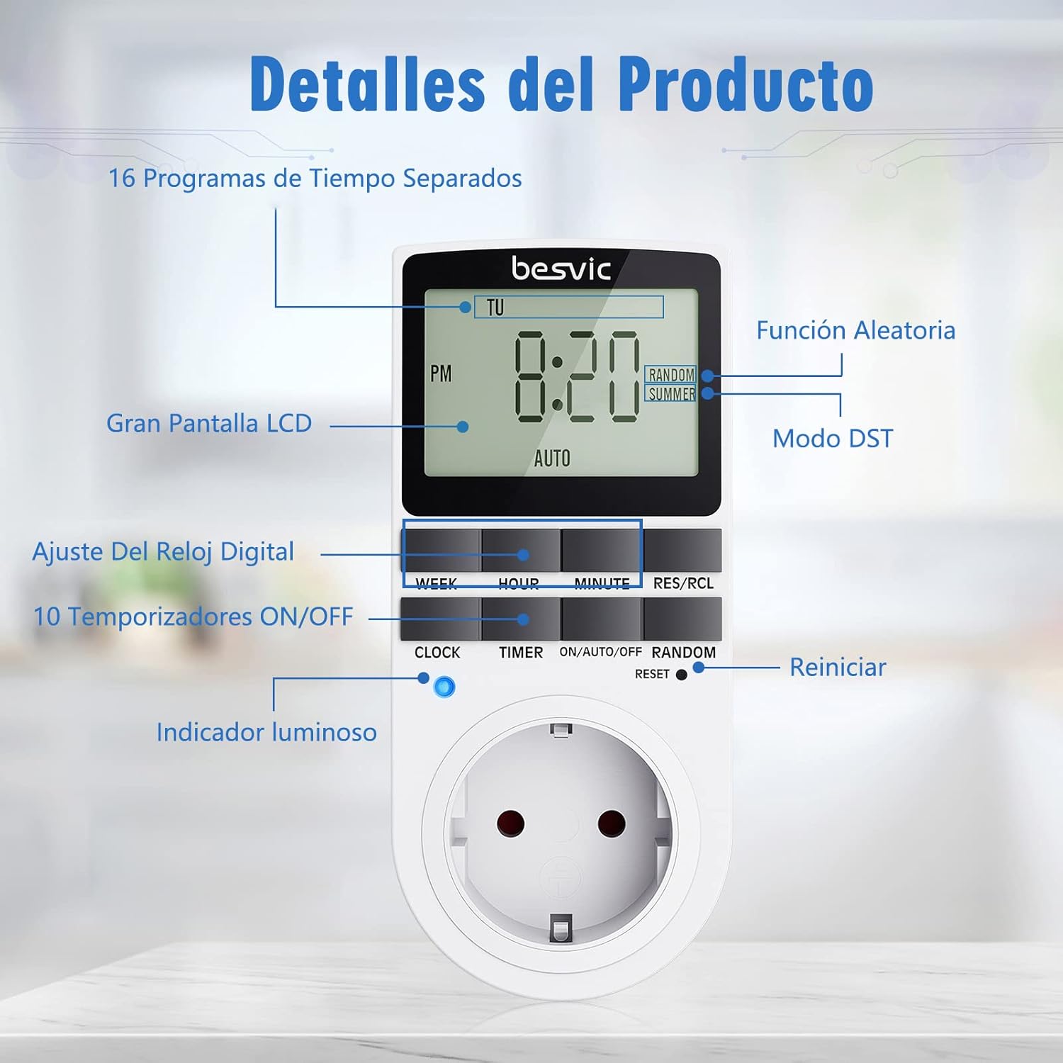 Añadir a la cesta Añadir a la cesta Opiniones de clientes 4,5 de 5 estrellas 1.312 4,5 de 5 estrellas 1.312 4,3 de 5 estrellas 627 4,3 de 5 estrellas 257 Precio 16,99 €€16,99 27, 99 €€27,99 — — Uso ON/OFF automático de luces o electrodomésticos ON/OFF automático de luces o electrodomésticos Calcule el costo de la electricidad Calcule el costo de la electricidad Potencia 16A / 3680W 16A / 3680W 16A / 3680W 16A / 3680W ON/OFF handbook ✓ ✓ Horario de verano ✓ ✓ Función aleatoria ON/ OFF aleatoriamente ON/ OFF aleatoriamente Programas 10 programas semanales 10 programas semanales Numero de producto 1 paquete 2 paquetes 1 paquete 2 paquetes