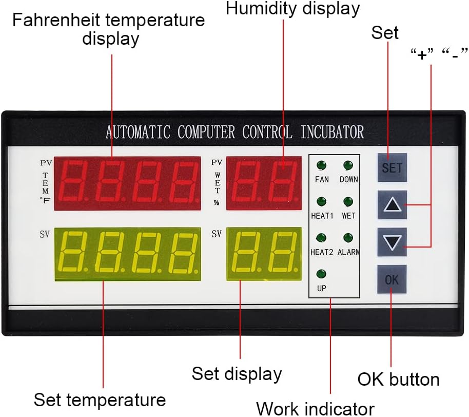 ESTE CONTROLADOR FAHRENHRENHEIT MULTIFORITO FAHRENHENHEIT AUTICATO Principalmento para Incubadore de Huevos. Con cuatro Pantallas de Visualización Digital Para Mostrar La Temperatura, La Humedad, El Número de Días de Incubación y de Rotación de Huevos, este le ayudará a Conocer y los datos de Incubación de Inmediato. Fácil de operar.