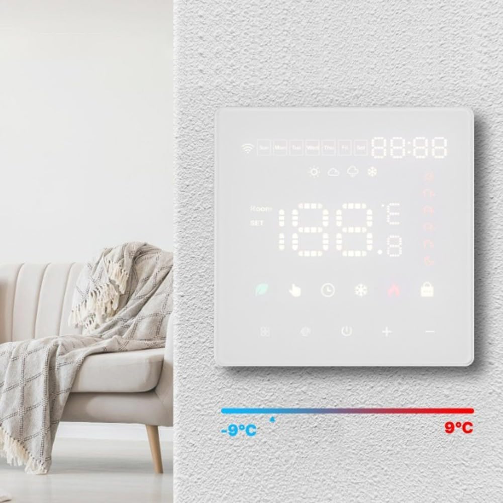 Gestión de temperatura de precisión: el termostato de calefacción de suelo equipado con sensores de temperatura duales ofrece lecturas precisas dentro de ± 0,5 °C, asegurando un management preciso sobre los sistemas de calefacción. Mantiene el calor constante sin fluctuaciones repentinas, creando un ambiente inside estable para salas de estar, dormitorios o espacios de trabajo. para aquellos que valoran el rendimiento térmico constante.
