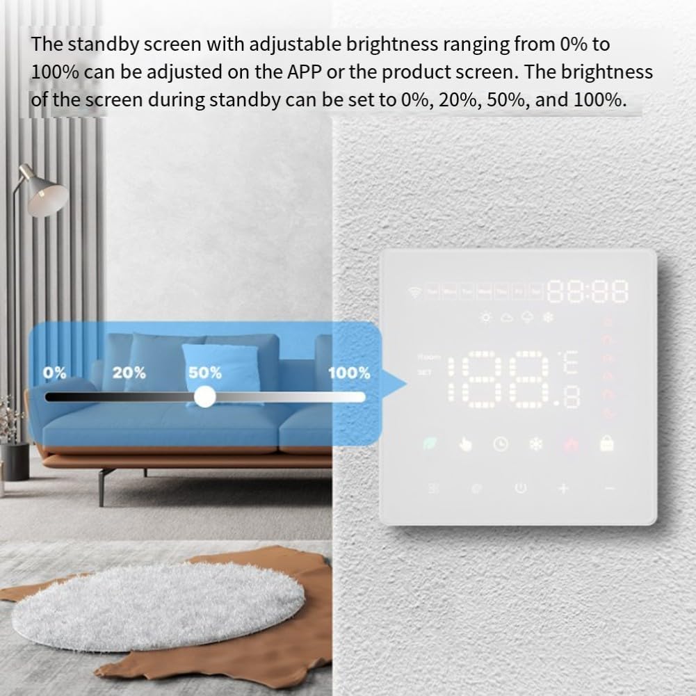 *Características de pantalla personalizables: el brillo de la pantalla del termostato se puede ajustar o apagar por completo, asegúrese de que no moleste su sueño. Esta característica agrega una capa de comodidad y personalización a su entorno doméstico.