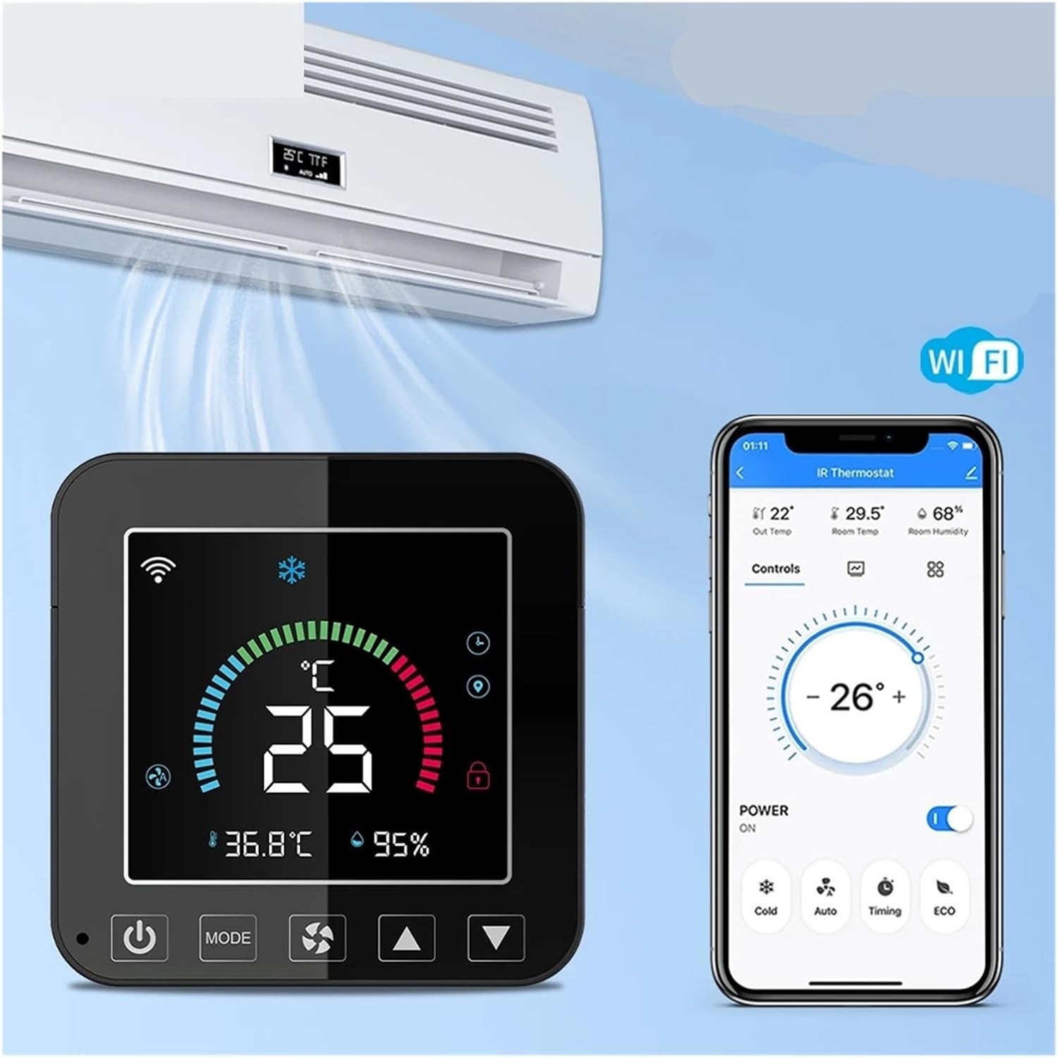 1. **Conectividad WiFi inteligente**: El controlador de temperatura y humedad del aire acondicionado por infrarrojos con termostato WiFi le permite controlar su aire acondicionado de forma remota a través de su teléfono inteligente, garantizando un confort óptimo en todo momento.