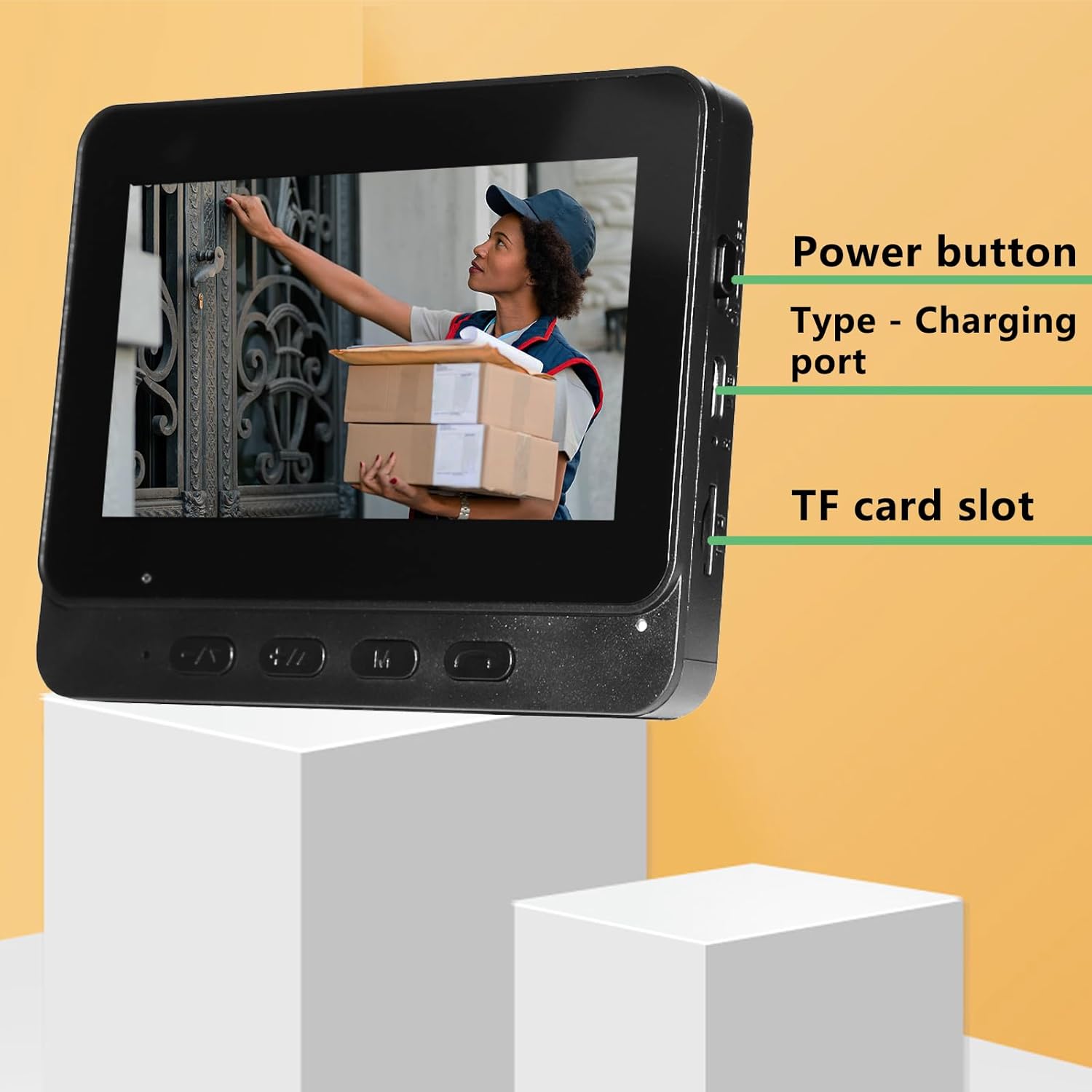【Audio Bidireccional】Permite llamadas de voz bidireccionales en interiores, brindando un audio bidireccional claro en tiempo actual, lo que le permite ver, escuchar y hablar directamente a través de la pantalla cuando hay visitantes.
