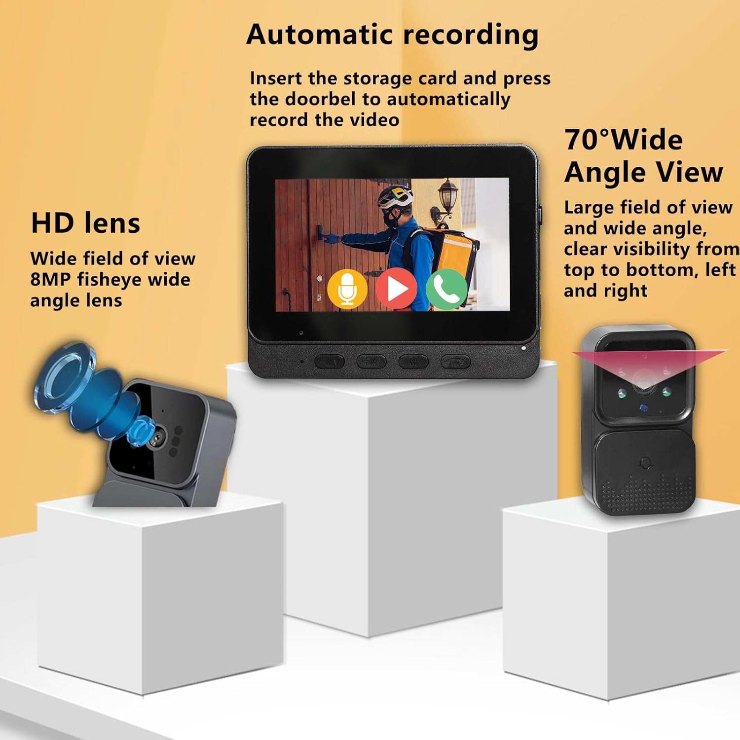 【HD y Súper Visión Nocturna】El timbre con cámara te proporciona imágenes nítidas y grabación de vídeo a través de 500 W píxeles de visualización en tiempo actual del estado de la puerta y un ángulo de visión de 70°. La luz infrarroja incorporada le permite ver con claridad incluso en la oscuridad.