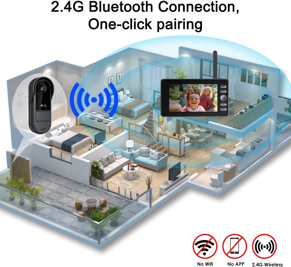 Este videoportero inalámbrico no requiere conexión wifi, lo que facilita su instalación y uso. Funciona mediante una transmisión confiable Bluetooth de 2.4G, lo que garantiza una comunicación fluida entre el timbre y el monitor hasta una distancia de 30 a 80 metros en un entorno sin obstáculos. En caso de obstáculos, la distancia limitada es de solo 5 a 30 metros. Elija una ubicación adecuada para instalar el timbre.