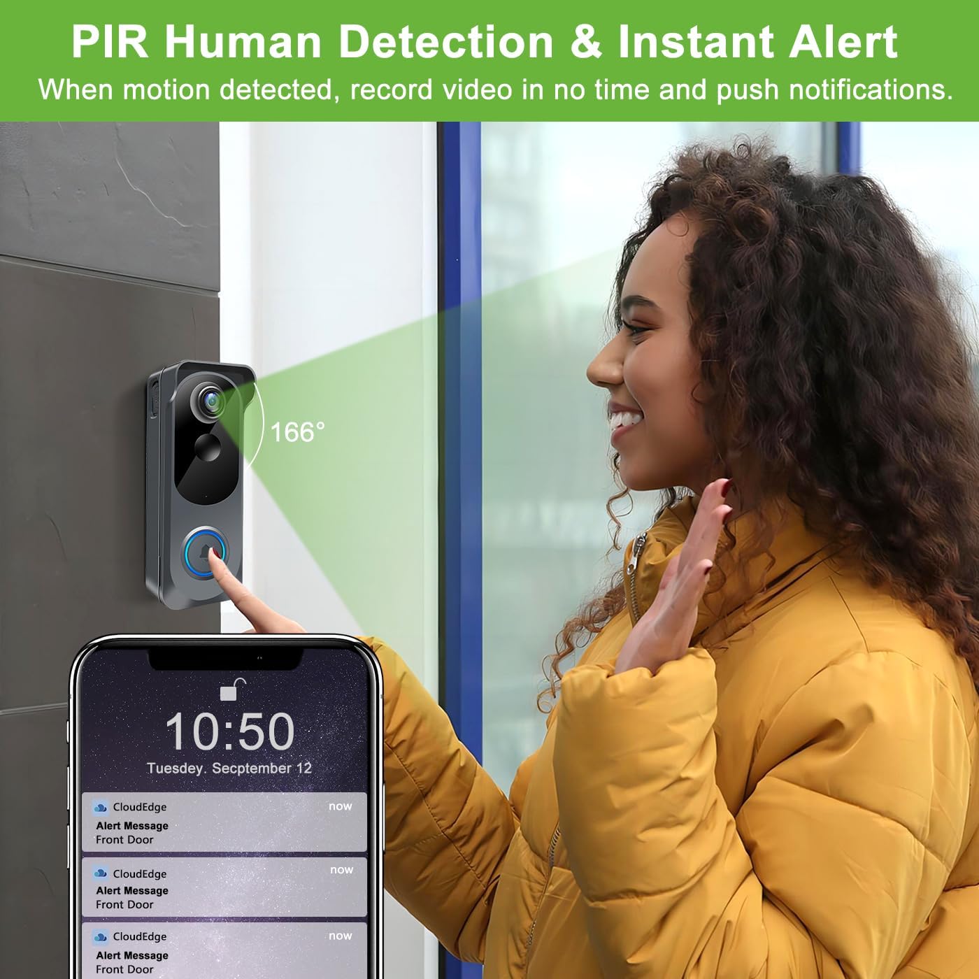 【1080p Full Hd y Visión Nocturna IR Y IP66 Waterpoorf】 el Timbre de video Te PresentA UN Video Full Hd de 1080p Con Una Visión Más Amplia de 166 °. Te Permitirá Disfrutar de una Claridad de Video Líder en la Industria y Una Visón Nocturna de Hasta 33 Pies, Llevándote la Experimencia Avanzada de Visión Nocturna. El Timbre protegido tu HOGAR DE DIA A NOCHE. Con una carcasa de materials IP66, La Cámae Inteligente de Timbre es resistente al Agua y Al Polvo y OfRece Un increormil Tiempo de Esera y Unrendimiento Duradero.