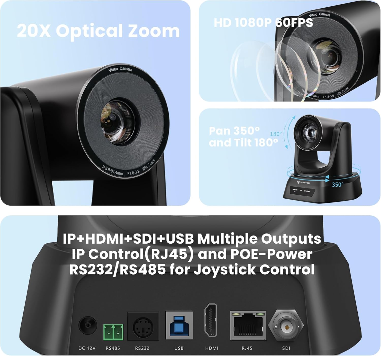 ✔ Salidas HDMI + SDI + IP + USB – La Cámae Tongveo Ptz Tiene Salidas Hdmi, SDI, IP y USB 2.0 para emitir Vídeos al Mismo tiempo. Admite AlimentAción Poe IEEE802.3A Y Management IP. Plug & Play Hdmi y USB 2.0 Puertos Están Disponibles para la Conexión un TV/monitor de la ONU. El Conector SDI (Requiere Un Convertidor) Permite La Transmisión de Vídeo A una distancia de Hasta 328 Pies/100 m. Formatos de compresión de Vídeo: Yuv, Mjpeg, H.264 y H.265. NOTA: No hay micrófono Incorporado.
