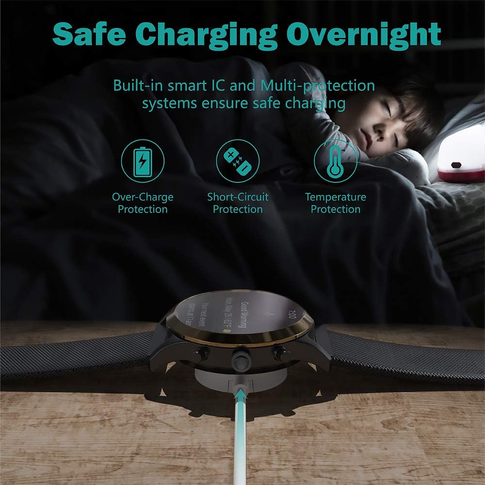 【Carga Segura】 Este cable de carga tiene un regulador de voltaje y PTC en el inside para proteger su dispositivo contra daños por sobrecorriente cuando se conecta a la fuente de alimentación. Hecho de protección contra sobretensión y sobrecorriente, protegerán su reloj de daños durante la carga