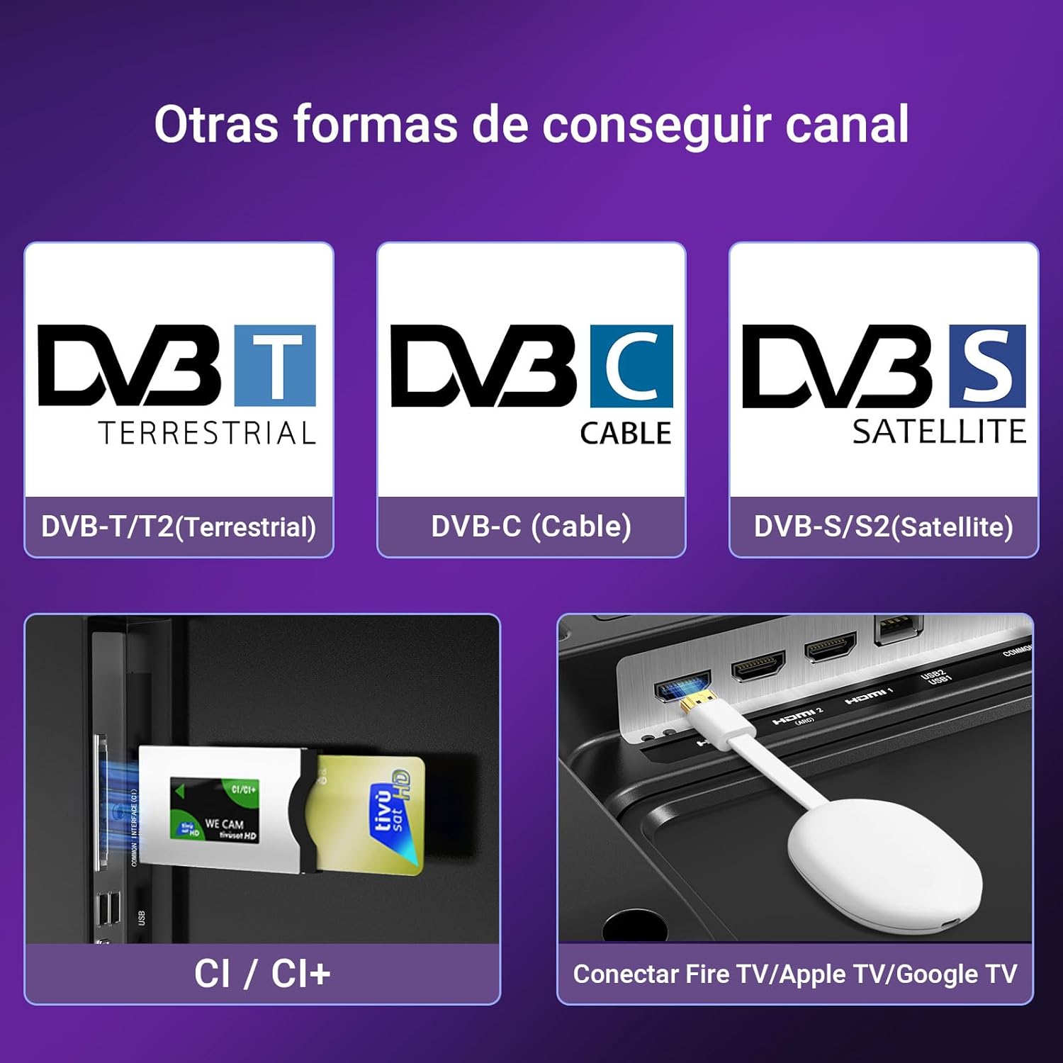 【Otra Manera】Si no tienes wifi, puedes conseguir canal a través de: (1). Conecte Ethernet para convertirse en un televisor inteligente; (2). cable (DVB-C), satélite (DVB-S/S2) o antena (DVB-T/T2). (3). Ranura CI (CI+) con módulo de TV HD+; (4). Conecte una TV Field como Fireplace TV, Apple TV, Google TV y más.