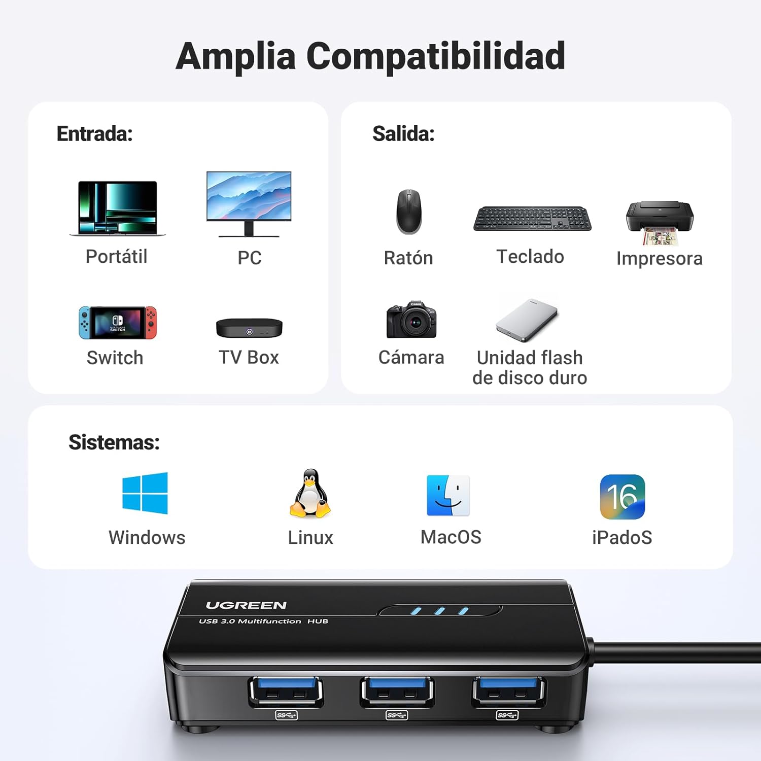 ( HUB USB 3.0 5GBPS VELOCIDAD ) Fácilmente expande 3 puertos USB 3.0 para su portátil, ultrabook o sobremesa y disfrutas de la velocidad de transferencia de 5Gbps siendo aún más productivo. Es ideally suited para conectar cualquier periférico como memorias externas, teclados, ratones, impresoras, discos duros, receptores BT, cámaras y más.