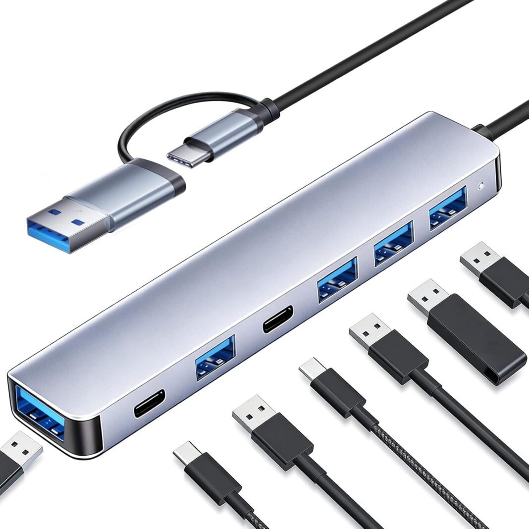 Expansión 7 en 2 de alto rendimiento: este multipuerto USB 3.0 convierte un único puerto tipo C en una conveniente estación de acoplamiento USB C con 1 × USB 3.0, 4 × USB 2.0, 1 × USB-C de datos y 1 × USB-C de 5 W de alimentación. El hub USB 3.0 C permite conectar teclado, ratón, pendrive, impresora o disco duro, optimizando el espacio de trabajo para Mac y PC