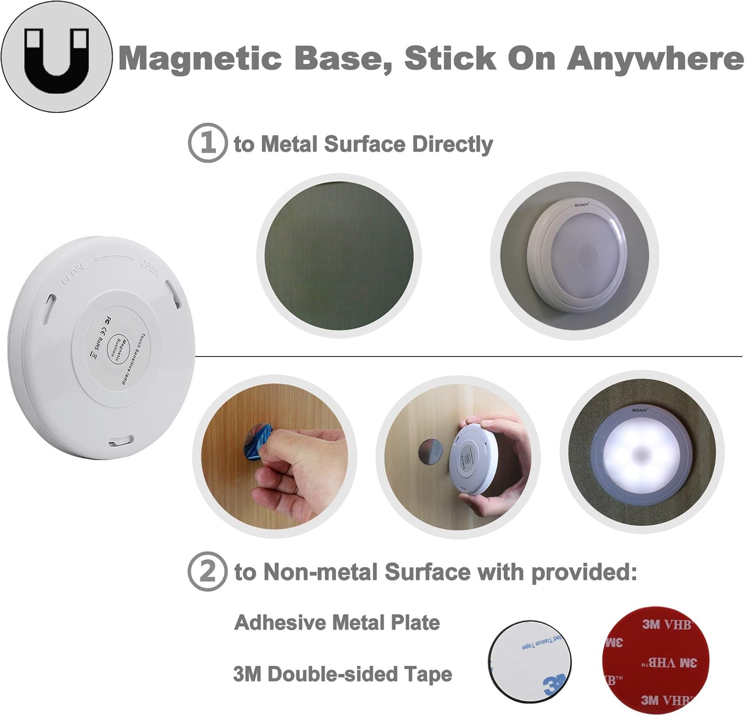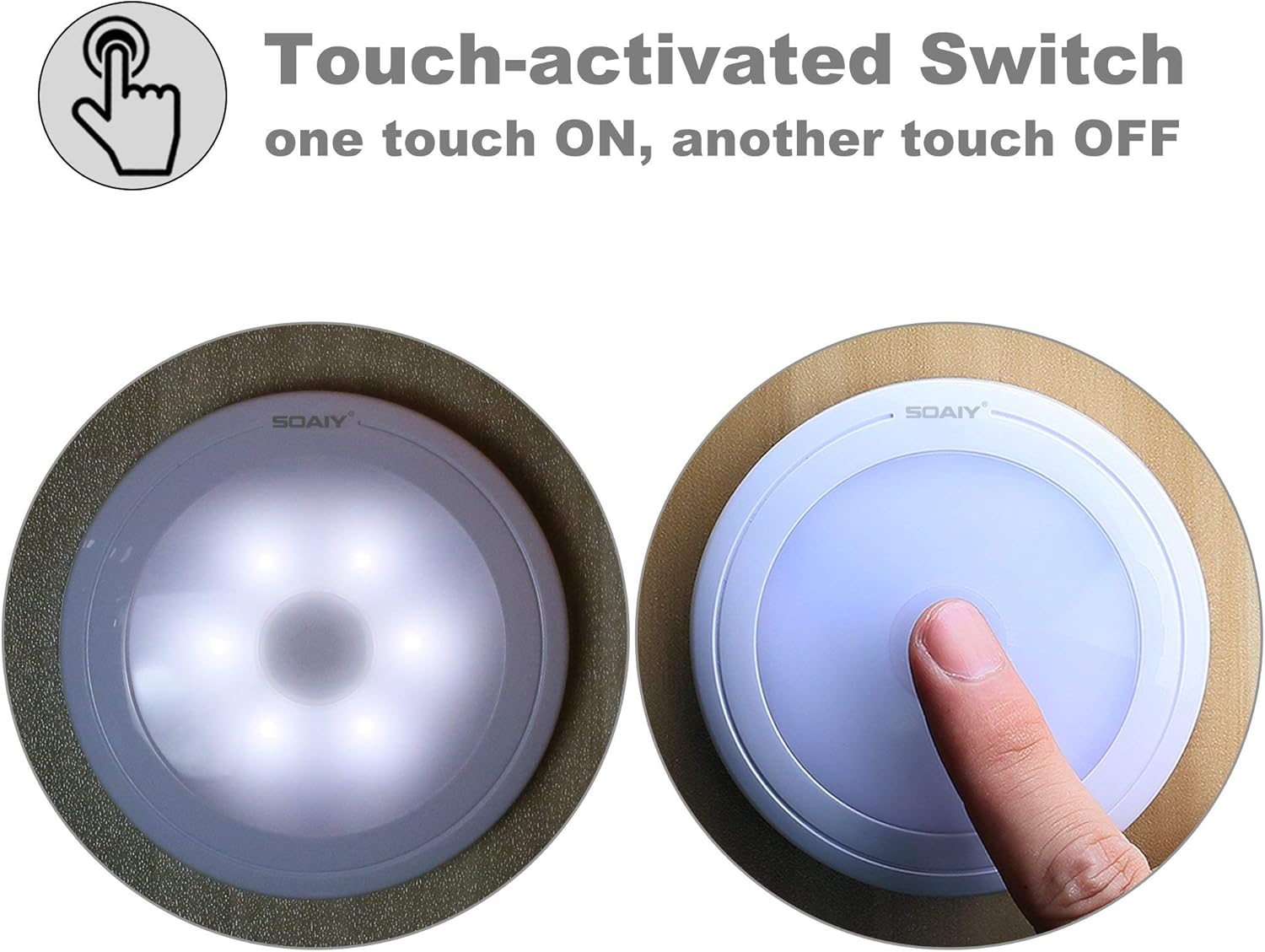 SOAIY 3Pcs Luz LED Nocturna con sensor al tacto puede iluminar los armarios, cajones, armarios o pasillos con un easy toque en el centro. Se puede colocar en cualquier lugar gracias al imán integrado en la parte posterior y una placa de steel adhesiva. Por lo tanto, simplemente puede quitar las lámparas, encender y colgar.