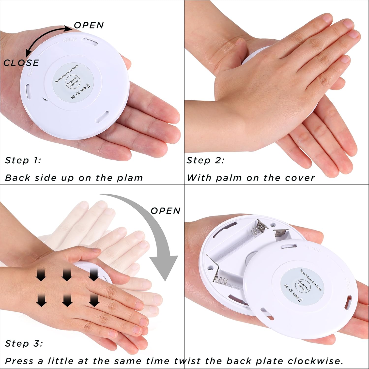 Potencia: MAX 0.4WDiámetro: 80mm; Espesor: 21mm Tipo de batería: 3 pilas AAA (NO INCLUYE) Lámpara: 1 lámpara con 6 LEDs SMD Shade de luz: Blanco Frío (5000K) Salida de luz: Aproximadamente 25 lúmenes con brillo máximoDos tipos para pegarlo: Cojines adhesivos de 3M o imán integrado Tocar el centro de la luz con sensor para apagar/encenderse/ajustar brillo Luminosidades ajustables y Memoria de modos
