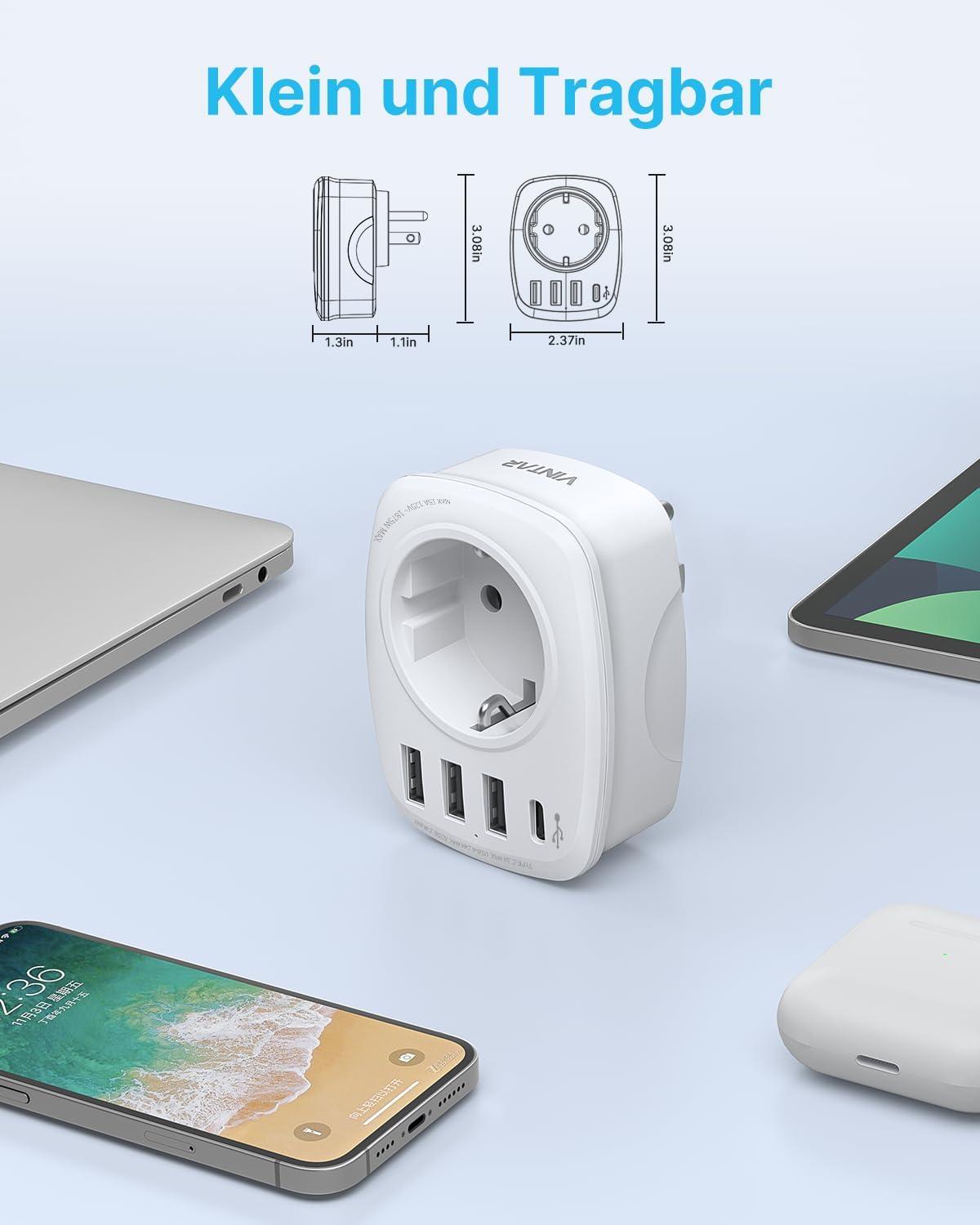 【Para el extranjero】Adaptador de viaje 5 en 1 de Europa (2 clavijas redondas Kind E/F) a EE. UU. (clavija plana, tipo B) con 3 puertos USB (5 V/2,4 A) y 1 puerto USB-C (5V/3A). Suitable con cámaras, teléfonos móviles, tabletas, computadoras portátiles, bancos de energía, auriculares, consolas de juegos, and so forth., adecuado para viajes de negocios o para recibir amigos extranjeros.
