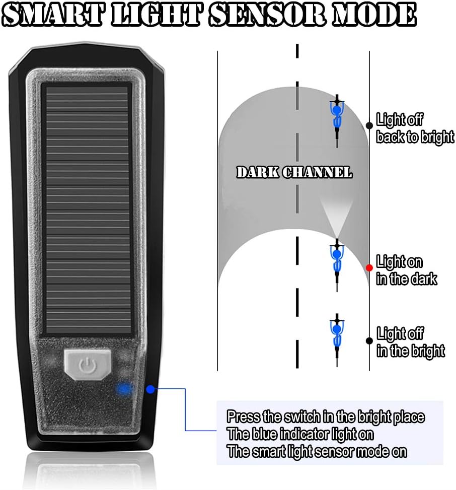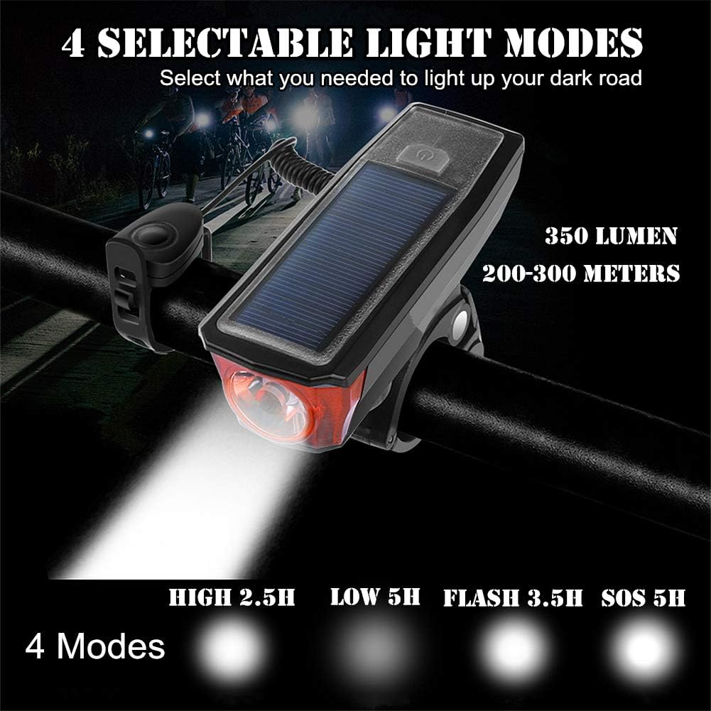 ✅ LUZ SOLAR PARA BICICLETA INTELIGENTE: Máx. 350 lúmenes, distancia de luz 200-300 metros. 4 modos Alto/Bajo/Flash/SOS, 2,5 horas para modo alto, 5 horas para modo bajo. IPX5 resistente al agua, no te preocupes por la lluvia.