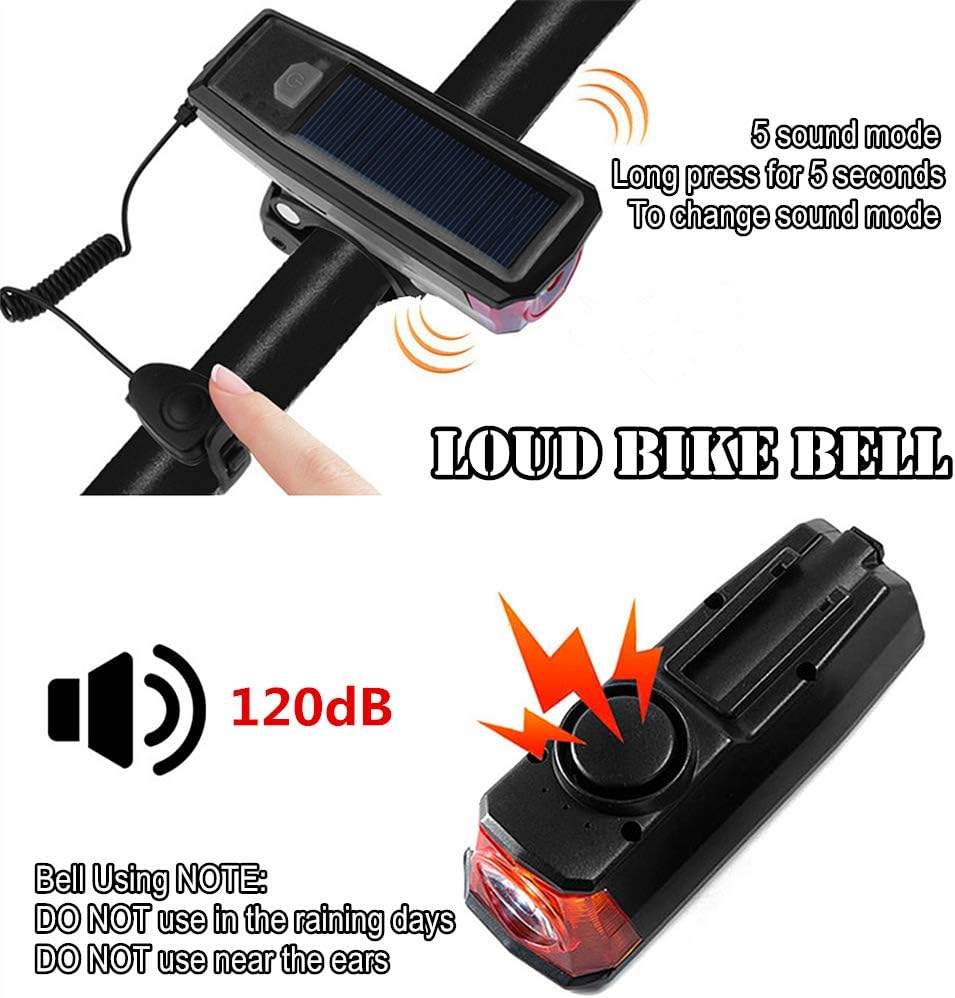 WASAGA Faro de Bicicleta, 4 Modos Luz Delantera de Bicicleta con energía Photo voltaic Inteligente Recargable con Campana de Bicicleta para Ciclismo Advertencia de Seguridad Altavoz LED