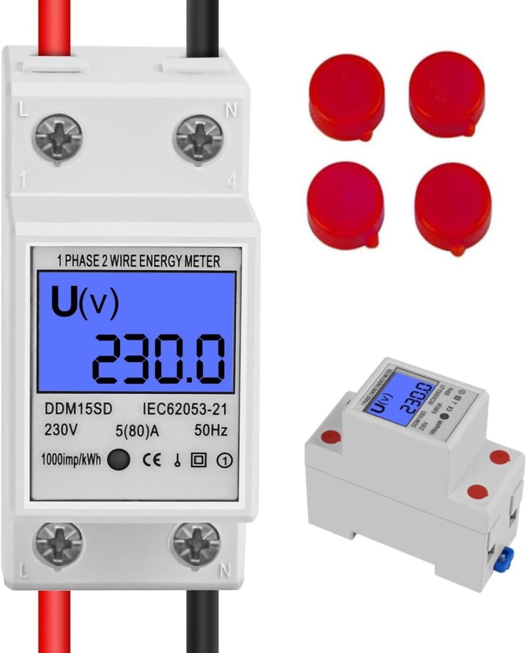 Contador de Energía Digital, Medidor digital de energía eléctrica, Medidor de Energía LCD Digital, Contador Eléctrico Monofásico, 2P DIN, 230V 5 (80) A