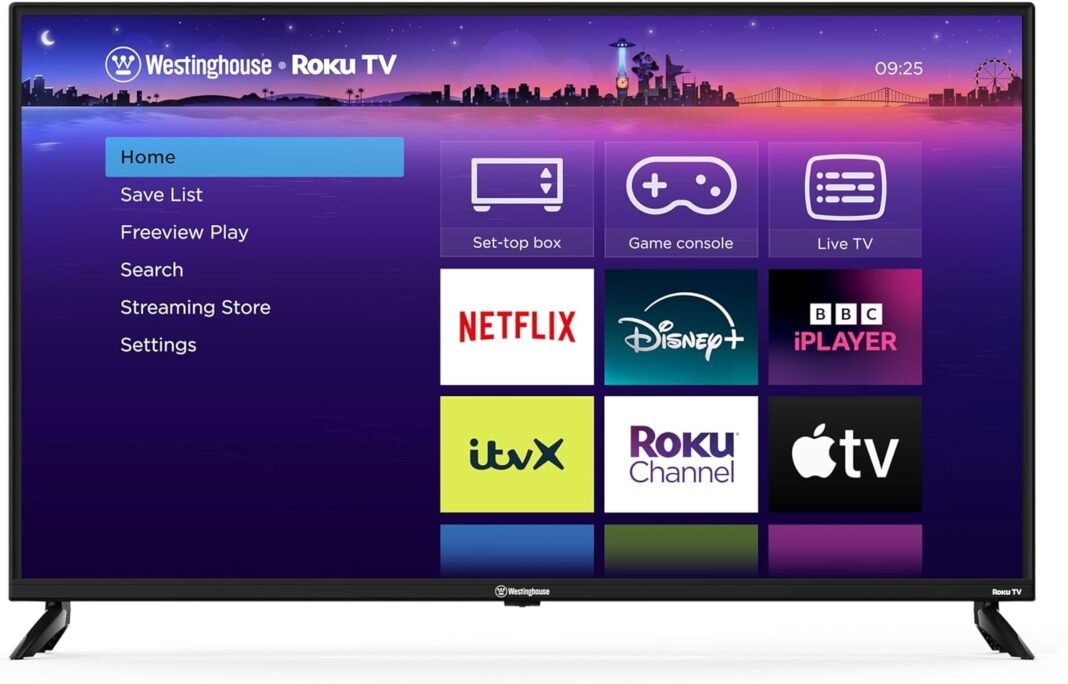 Mejora tu entreteniMiento Con el televisor Inteligente Roku Westinghouse de 43 Pulgadas, Televisor de la ONU Inteligente Versátil y de Bajo Consumo Diseñado para Espacios de Vida Modernos. Con Diseño Ultrafino, ESTA PANTALLA DE 43 PULGADAS ES Ideally suited para salones compactos, Dormitorios o incluso Pisos Compartidos, OfReciendo una visualizaciónón envolvente sin dominar tu espacio. Transmite más con Roku Os y Gasta Menos Con Su Clasificación Energética F