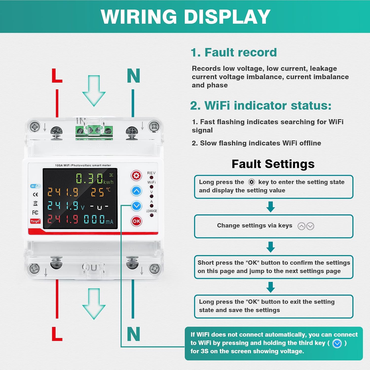 Medidor de electricidad inteligente Amplio rango de medición: voltaje AC 80-300V; corriente 1-100A; indicación de potencia 0-99999.9Kwh; frecuencia: 50/60Hz; corriente de fuga: 10-99mA; protección contra sobretensión: 120-300V CA; protección contra subtensión: 80-210V AC.