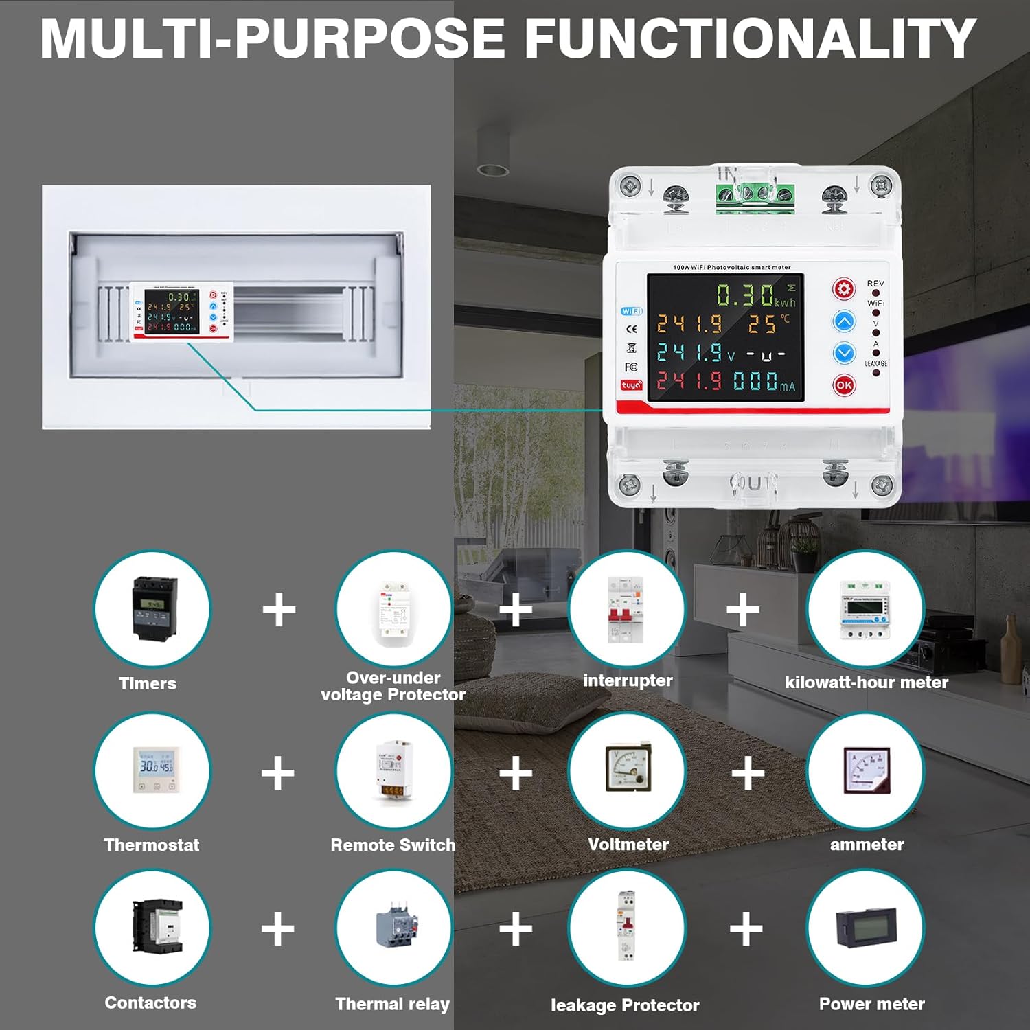 Medidor inteligente WIFI: conecta el dispositivo sob o estado WIFI, distancia ilimitada tuya controle APP inteligente, exposición en tiempo actual de energía, corriente, tensión, vazamento, frecuencia, potencia acumulativa y otros tipos de datos.