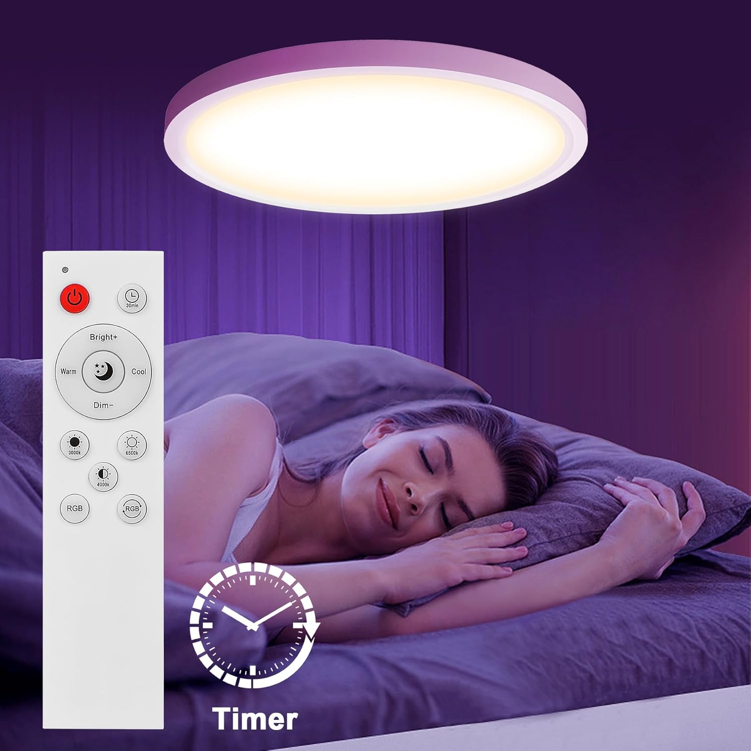 PROTECCIÓN DE LOS OJOS: La lámpara de techo LED está hecha de una pantalla esmerilada de alta calidad con una superficie brillante. Debido a la alta transmitancia, la luz se distribuye uniformemente por toda la habitación sin deslumbramiento, haciendo que los ojos se sientan más cómodos. También el brillo se puede ajustar de acuerdo a diferentes escenarios de uso, 10%-100% a través de la APP. o el mando a distancia IR.