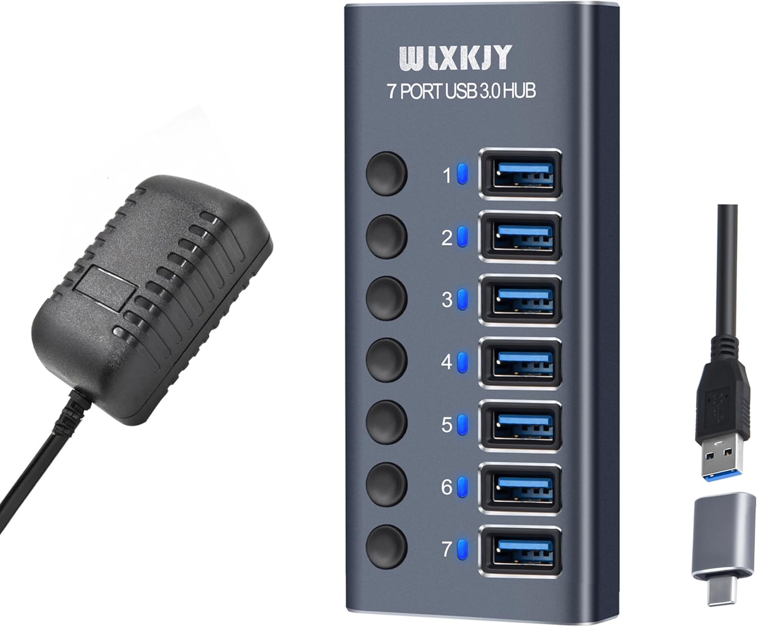 【Lo que obtienes】 WLXKJY Aleación de aluminio de 7 puertos USB Hub x 1; Fuente de alimentación de 36 W (12 V/3 A) x 1; USB 3.0 x 1 cable; 1 cable de alimentación; 1 cable de alimentación; 1 cable de alimentación; 1 USB A-C de aluminio.