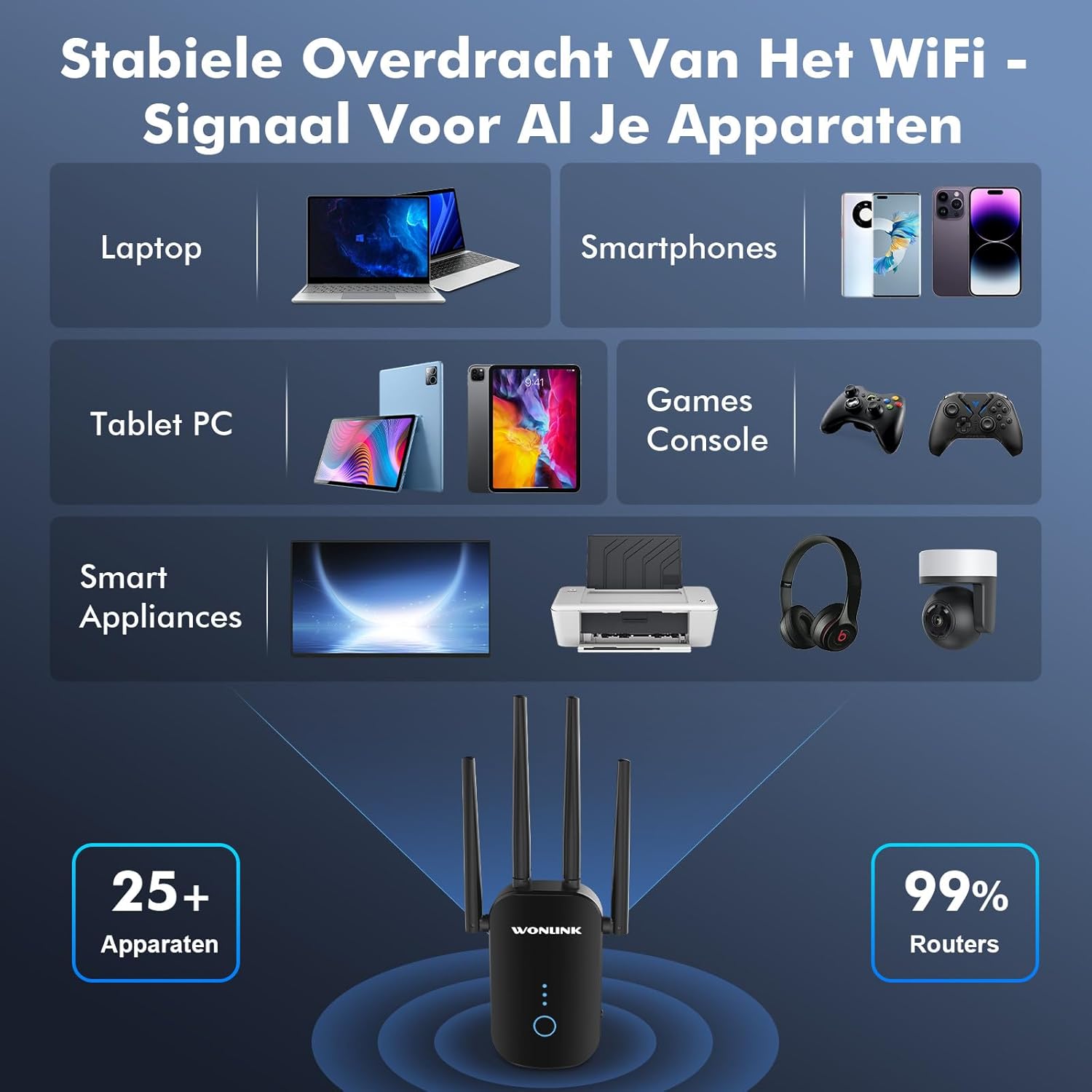 Potente Amplificador Wifi: ESTE Amplificador de Señal Wifi Soporta Bandas Duales (2.4Ghz Hasta 300Mbps, 5GHz Hasta 867Mbps) Con Velocidades Wifi Whole de Hasta 1200Mbps. El Repetidor Está Equipado Con 4 Antenas de Alta Ganancia Para Un mejor Rendimiento Inalámbrico, Velocidad de TransmisioN y Estabilidad