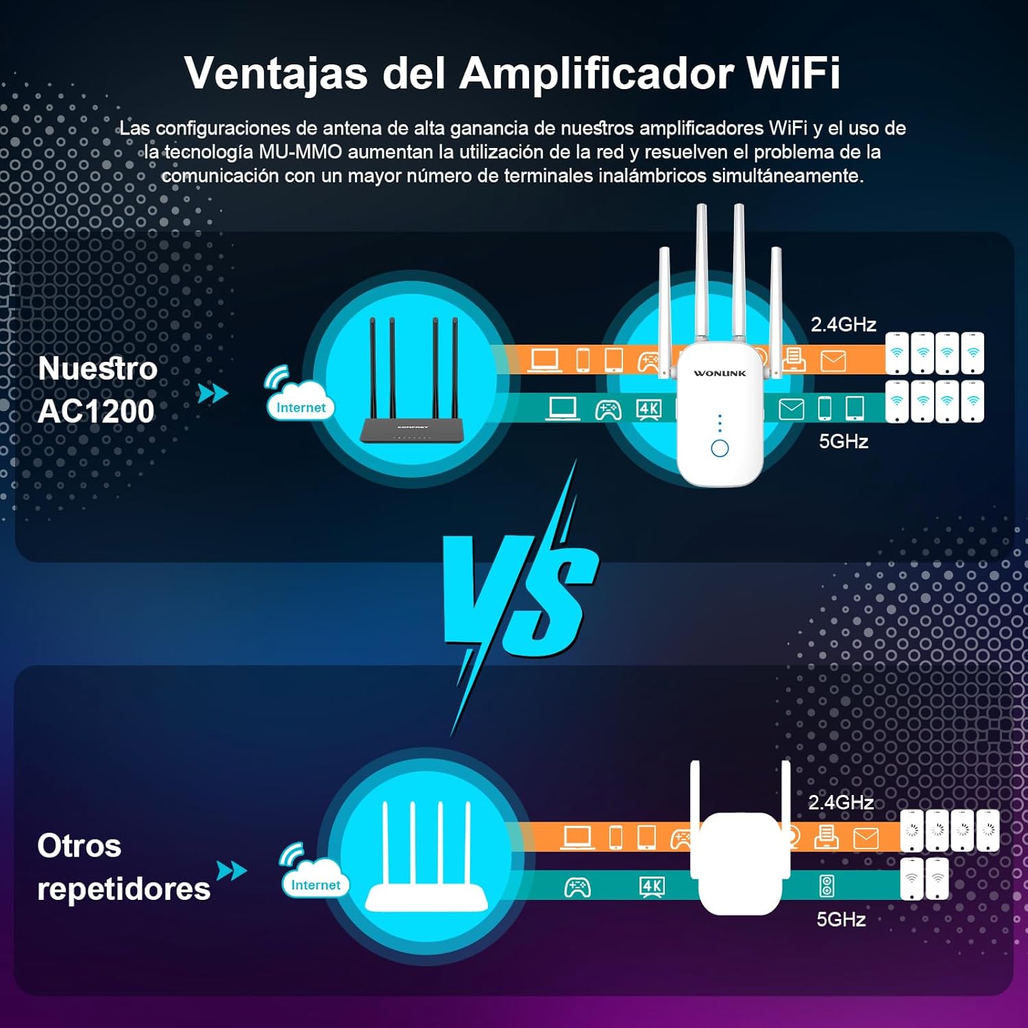 Potente Amplificador Wifi: ESTE Amplificador de Señal Wifi Soporta Bandas Duales (2.4Ghz Hasta 300Mbps, 5GHz Hasta 867Mbps) Con Velocidades Wifi Whole de Hasta 1200Mbps. El Repetidor Está Equipado Con 4 Antenas de Alta Ganancia Para Un mejor Rendimiento Inalámbrico, Velocidad de TransmisioN y Estabilidad