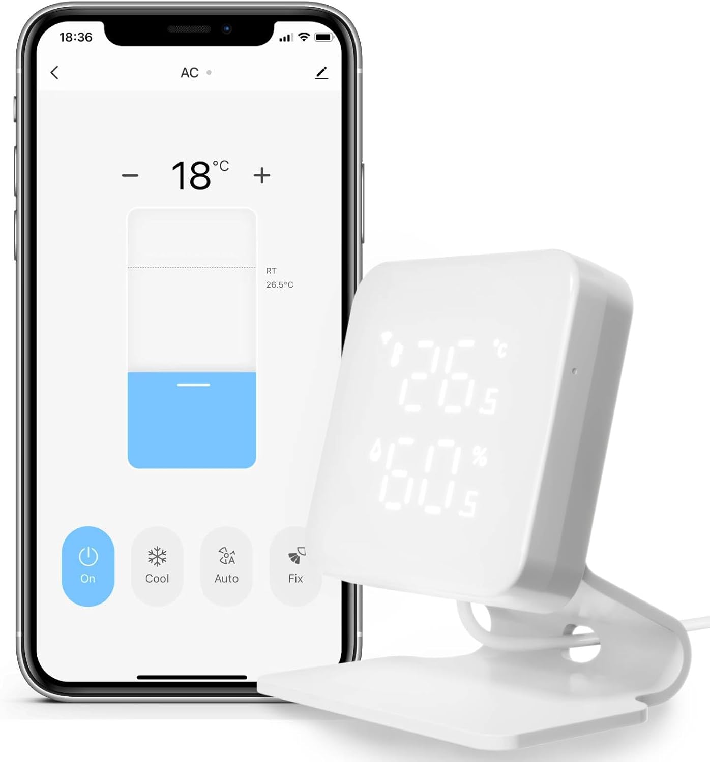 【Soporte】Nuestro equipo de soporte al cliente está a tu disposición 24/7 en caso de que enfrentes algún problema. Con un tamaño compacto de 2.7″x 2.7″x 0.7″, se puede colocar en una mesa o en cualquier lugar con un soporte Accesorios: 1* Controlador Inteligente de Aire Acondicionado con sensor de T&H, 1* soporte+plataforma, 1* alimentador USB-C, 1* handbook, 1* pin.