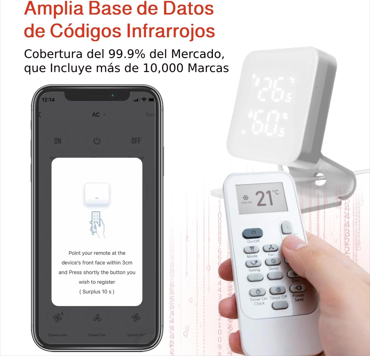 Este producto monitorea la temperatura y la humedad y actúa como management remoto common para aires acondicionados, televisores y ventiladores. Se integra con productos WOOX para automatizar el management de dispositivos.