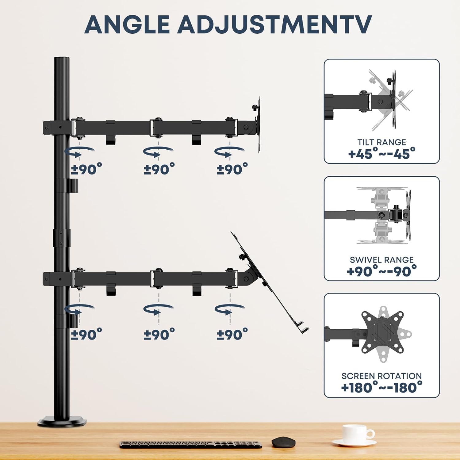 Soporte de escritorio para monitor de portátil de movimiento completo: rotación de 360°, giro de ±90° e inclinación de ±45° para un ángulo de visión óptimo. La bandeja para portátil se puede inclinar ± 45°. El soporte para monitor para portátil también se eleva y baja libremente en un poste central de 803 mm.