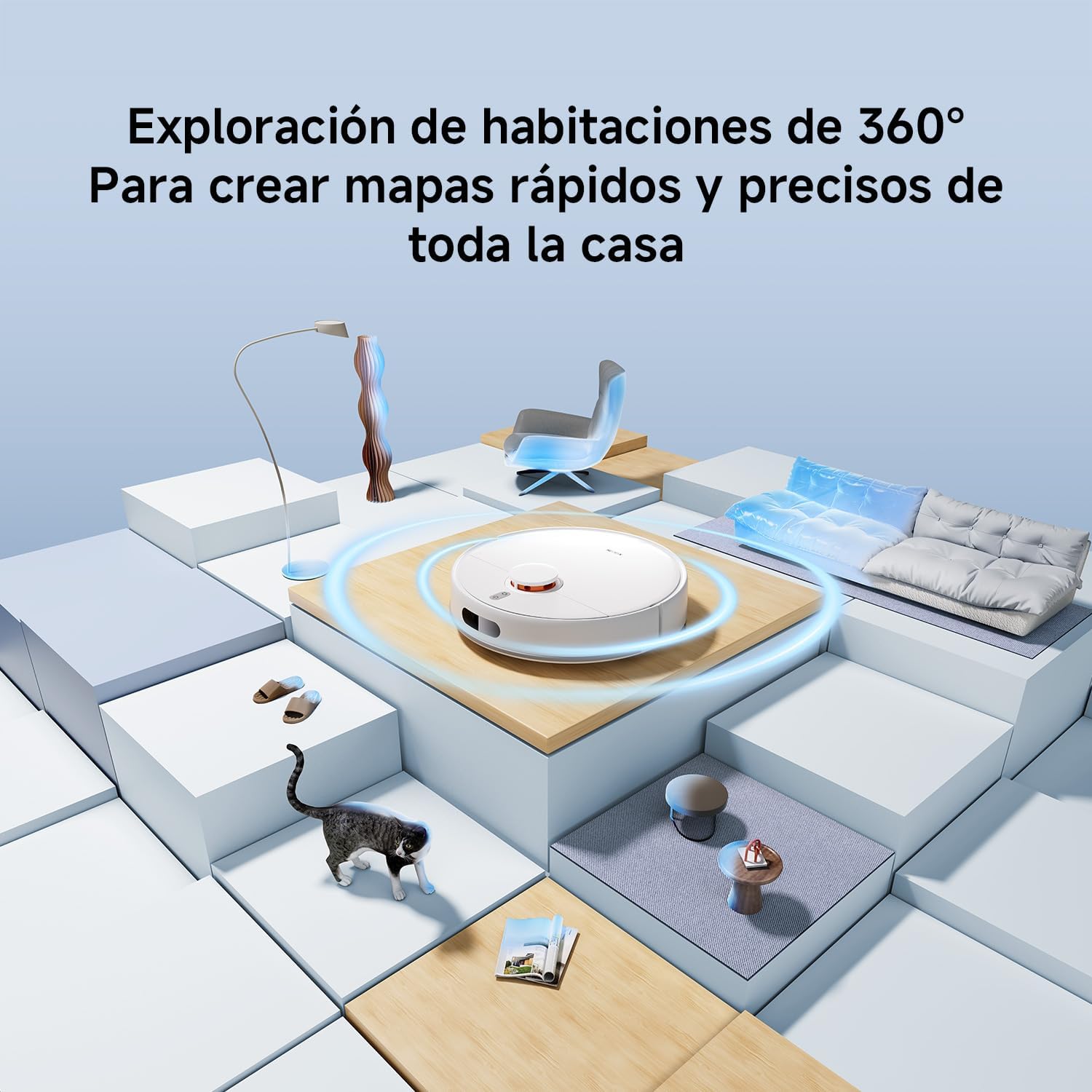 imagen de contenido adicional imagen de contenido adicional El texto dice: «Sistema de navegación láser LDS Para mayor agilidad a la hora de evitar obstáculos». Diagrama que muestra un dispositivo robótico con un haz de escaneo láser azul. El texto dice «Exploración de habitaciones». Visualización arquitectónica en 3D que muestra el interior de una habitación minimalista con muebles y elementos de planificación de la distribución. El texto dice: «Limpeza inteligente personalizada Para satisfacer diversas necesidades». Plano de planta en 3D que muestra la distribución de las habitaciones con un mapa de rutas de limpieza en azul.
