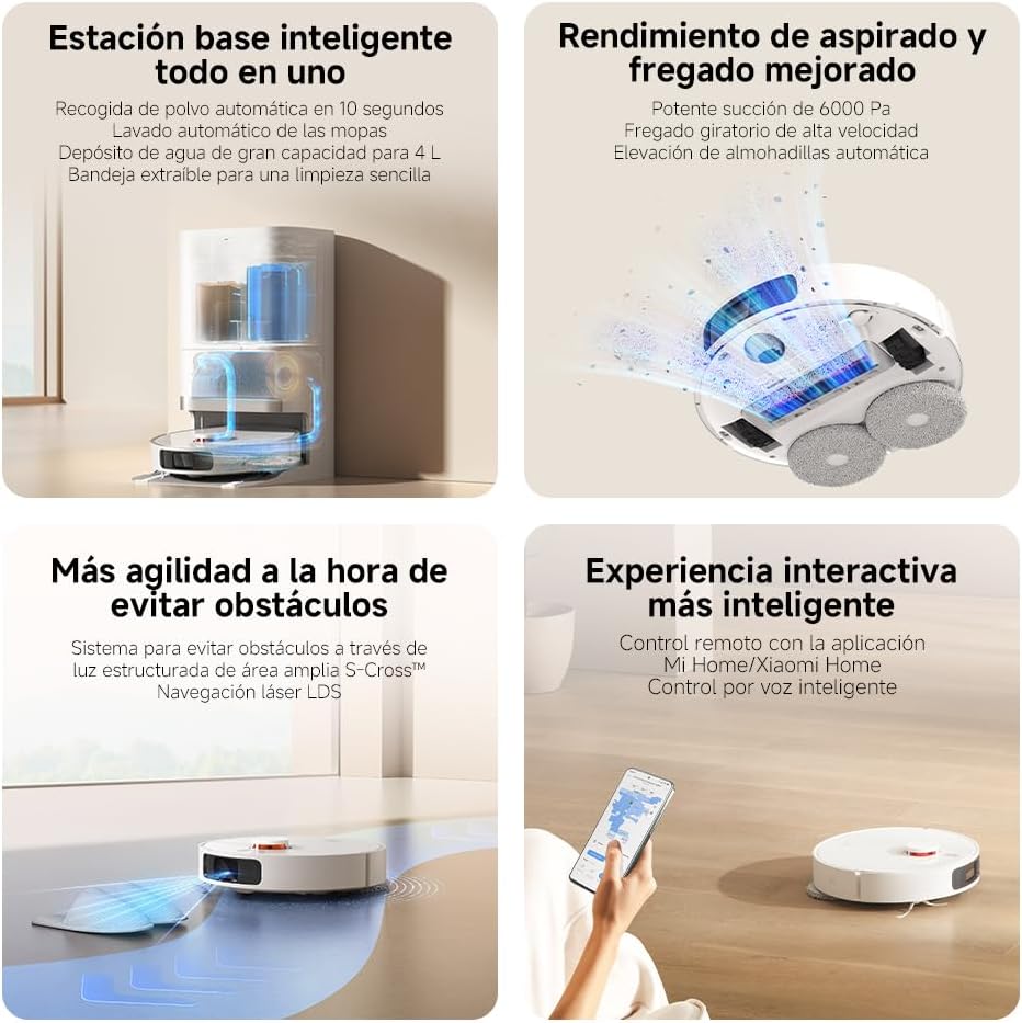 【Management inteligente con la App Xiaomi Dwelling】Programación y automatización de procesos de limpieza a través de la app Xiaomi Dwelling. Elección de 4 modos de limpieza (por ejemplo, primero aspirar y luego fregar), configuraciones de zonas prohibidas y programación precisa para todas las habitaciones.