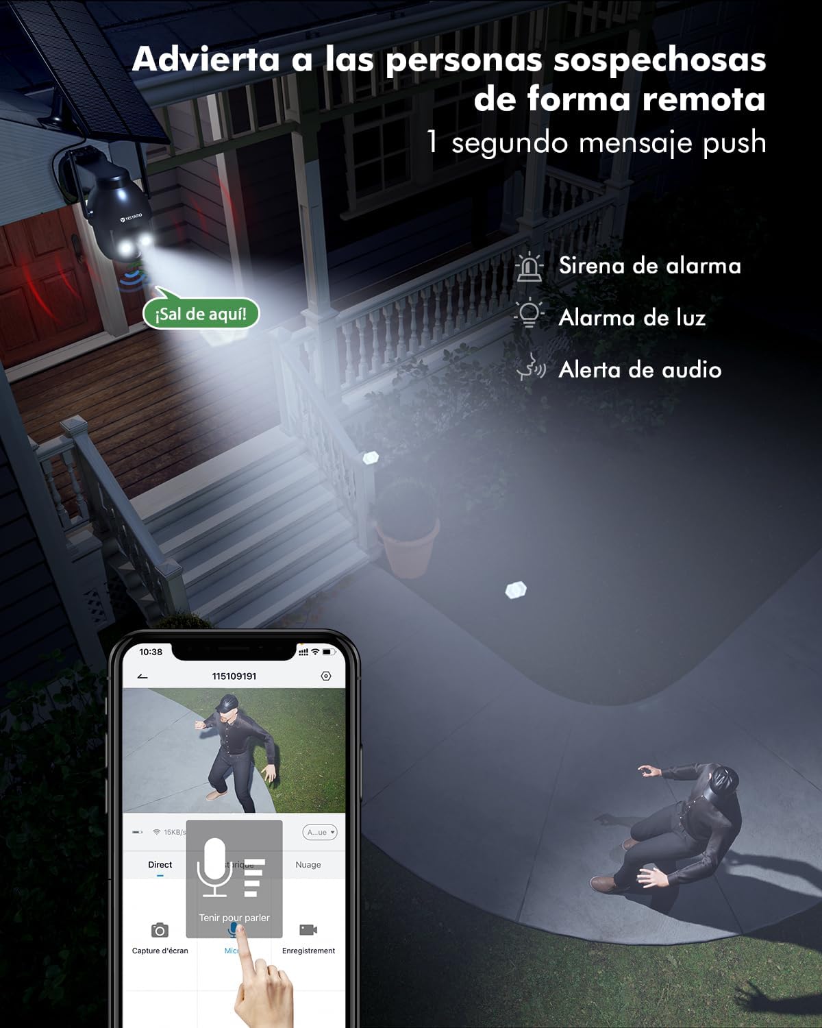 【PIR Detección y triple alerta】La cámara exterior inalámbrica tiene una versión mejorada del sensor infrarrojo inteligente PIR, puede analizar los contornos del cuerpo humano y detectar movimientos, reduciendo de manera efectiva las falsas alarmas. Una vez que se detecte una persona sospechosa, las luces se encenderán y la alarma será alertada. El teléfono se recordará inmediatamente (1S) y la alerta voz de cámara se enviará inmediatamente.