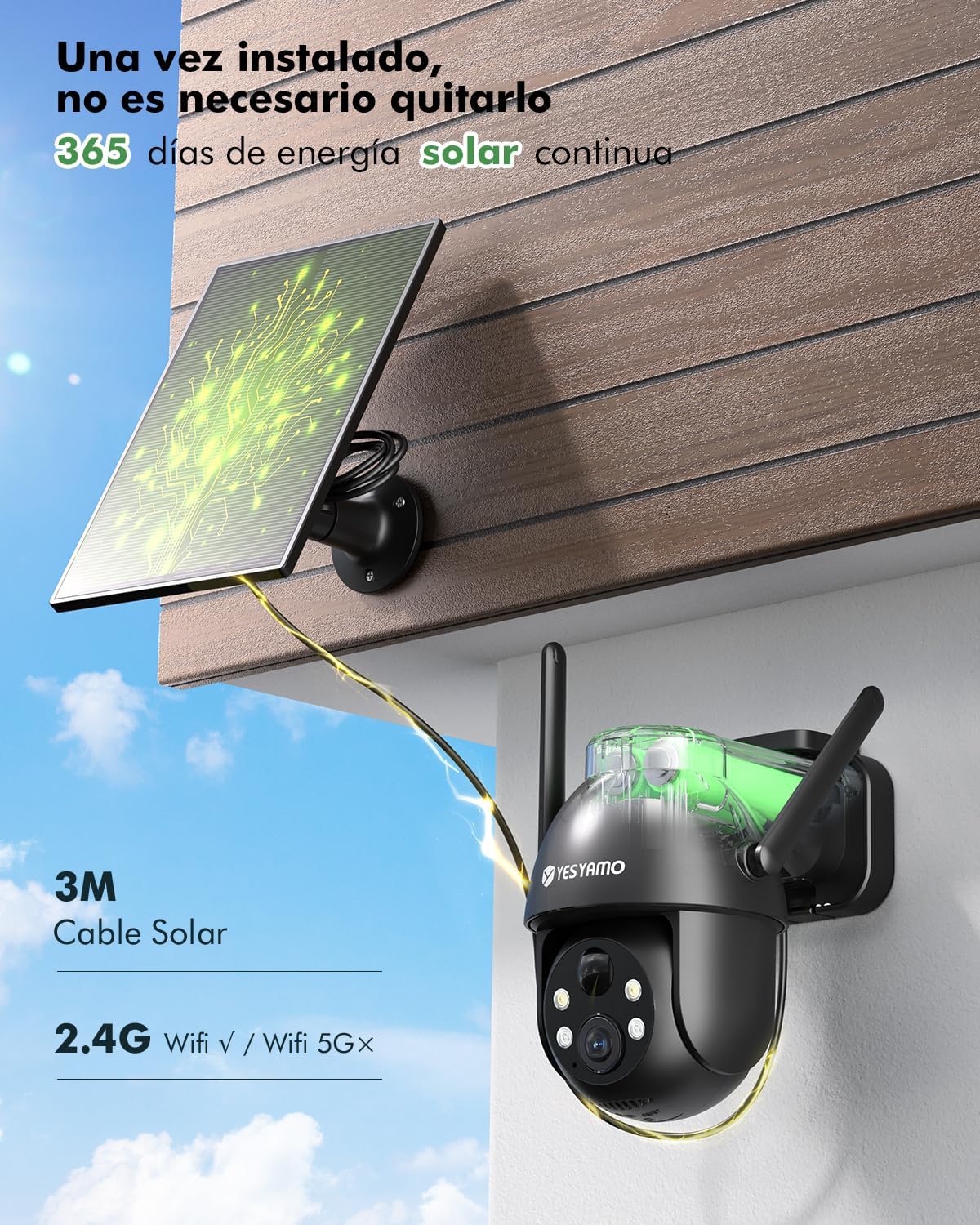 【2K QHD, 3MP y 100% inalámbrica】La cámara exterior photo voltaic ofrece una imagen QHD de 2K y una función de zoom digital de 5x, que está mucho más allá de lo que las cámaras exteriores 1080P. El 100% inalámbrico garantiza que no haya cables de pink o cables de alimentación adicionales que puedan causar problemas. Simplemente conecta el panel photo voltaic y podrás usarlo los 365 días del año.