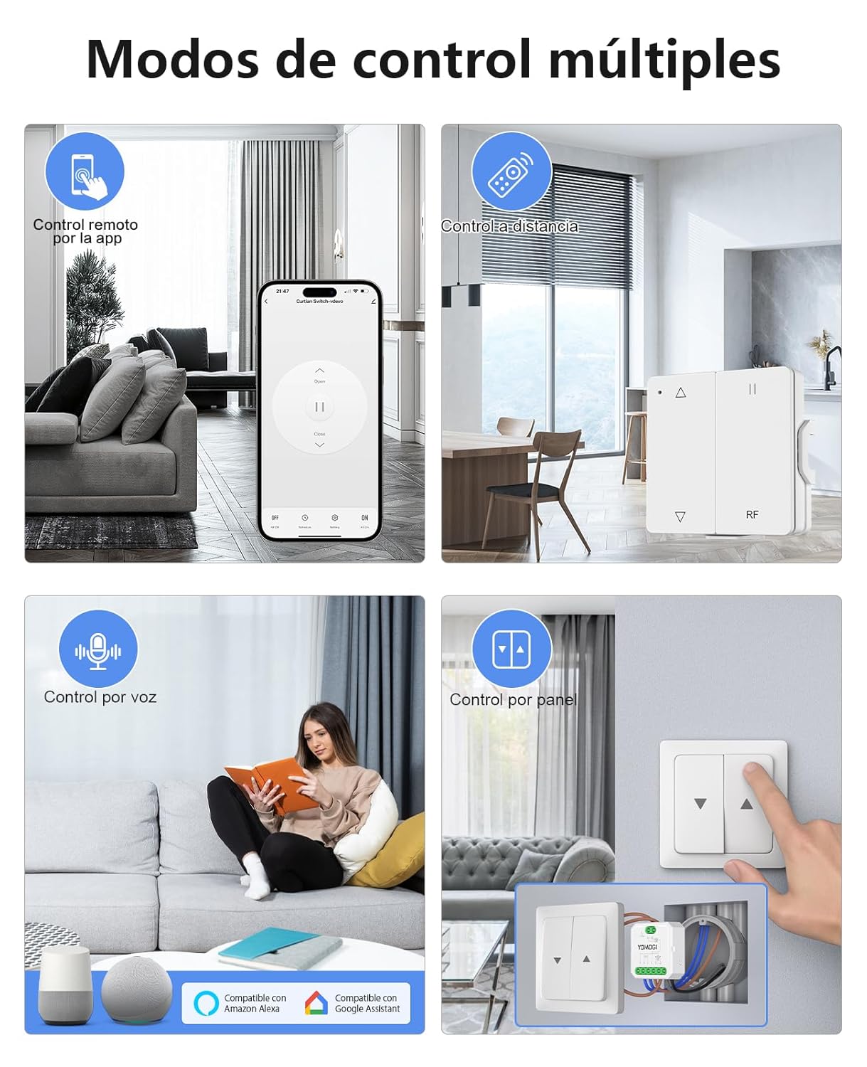 Tres Modos de Management: Controla fácilmento Tus Cortinas Con Mando A Distancia, Smartphone y Comando de Voz. El Mando A Distancia rf Ya Está Emparejado y Listo para Usar Después de retirar la Tarjeta de Plástico. Permite El Management Remoto Hasta 50 M sin obstáculos.