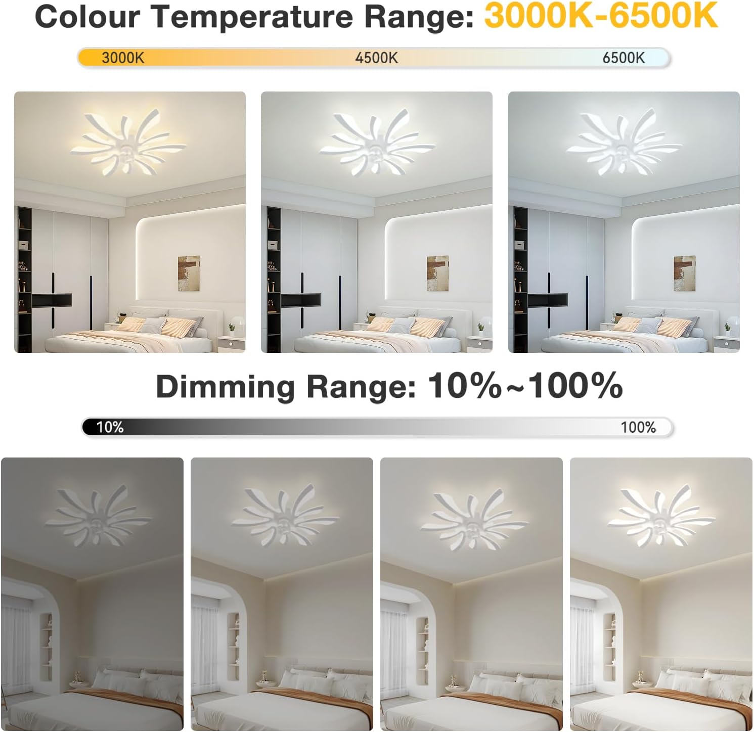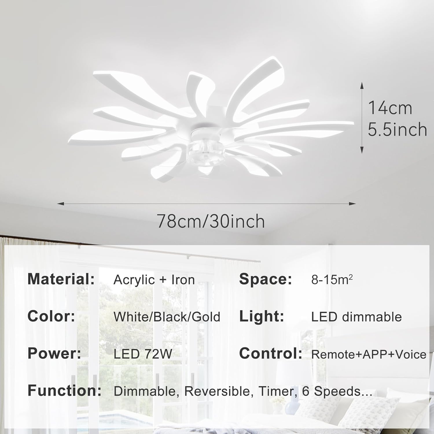 Diseño único – El dormitorio lámpara ventilador techo es como una flor en plena floración, que se abre ingeniosamente en el techo, creando un efecto de luz mágica y asombrosa. Con un diámetro de 78 cm, se adapta perfectamente a todo tipo de espacios interiores, aportando un ambiente moderno y elegante a los dormitorios, salones, cocinas y oficinas.